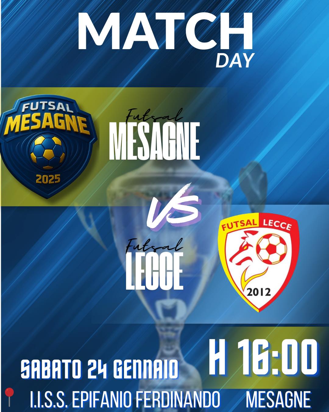 Nuovo appuntamento casalingo con la Futsal Mesagne. Sabato 24 gennaio alle ore 16:00 la Palestra dell’Istituto Epifanio Ferdinando in via Eschilo si accenderà per l’attesissimo scontro di Coppa contro la Futsal Lecce. Si tratta di una sfida importante che richiede cuore e determinazione in ogni secondo di gioco.