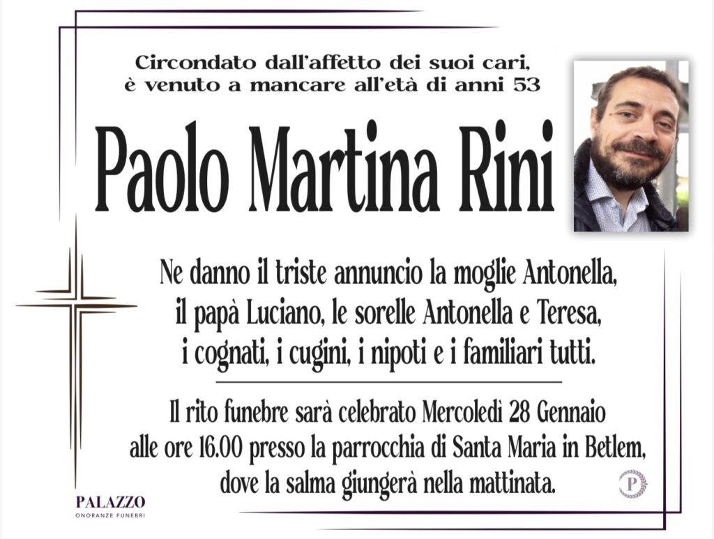 La comunità mesagnese piange la scomparsa dell’assistente capo coordinatore Paolo Martina Rini, 53 anni, in servizio presso il Commissariato P.S. di Mesagne. La morte è avvenuta nella notte.