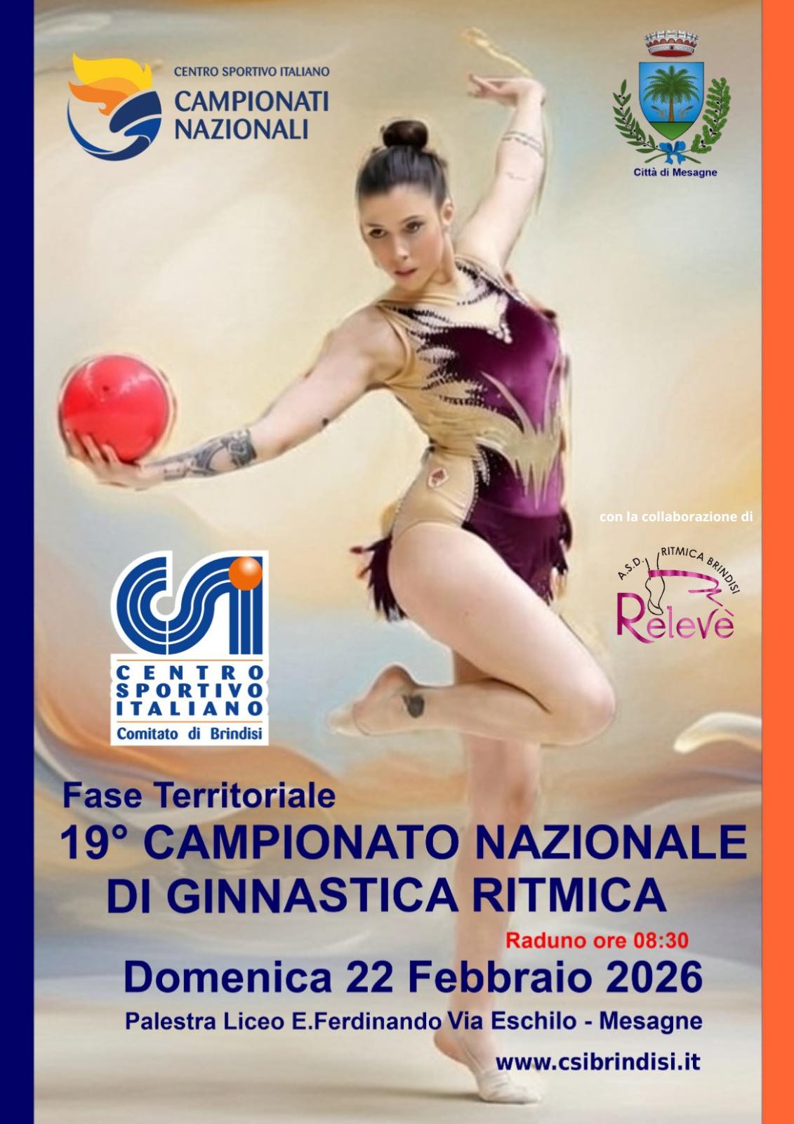 Domenica 22 Febbraio 2026, a partire dalle 8.30, la grande ginnastica torna protagonista nella provincia di Brindisi. Il Centro Sportivo Italiano (CSI) – Comitato di Brindisi, con la collaborazione dell’A.S.D. Ritmica Brindisi “Relevè” e con il patrocinio della Città di Mesagne, organizza la fase territoriale del 19° Campionato Nazionale di Ginnastica Ritmica.