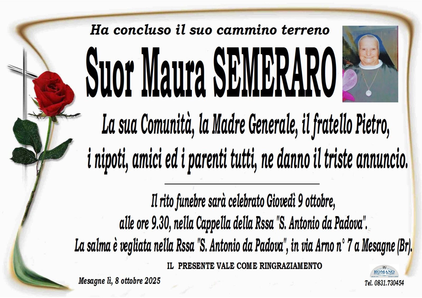 Oggi, alle ore 9.30, nella chiesetta dell’istituto, si terranno i suoi funerali. Suor Maura ha dedicato la sua esistenza all’assistenza degli anziani e alla vicinanza ai bambini, con instancabile generosità. Esperta cuoca, è ricordata con affetto anche a Torre Santa Susanna, dove ha lasciato il segno per la sua dedizione e il profondo senso del servizio.