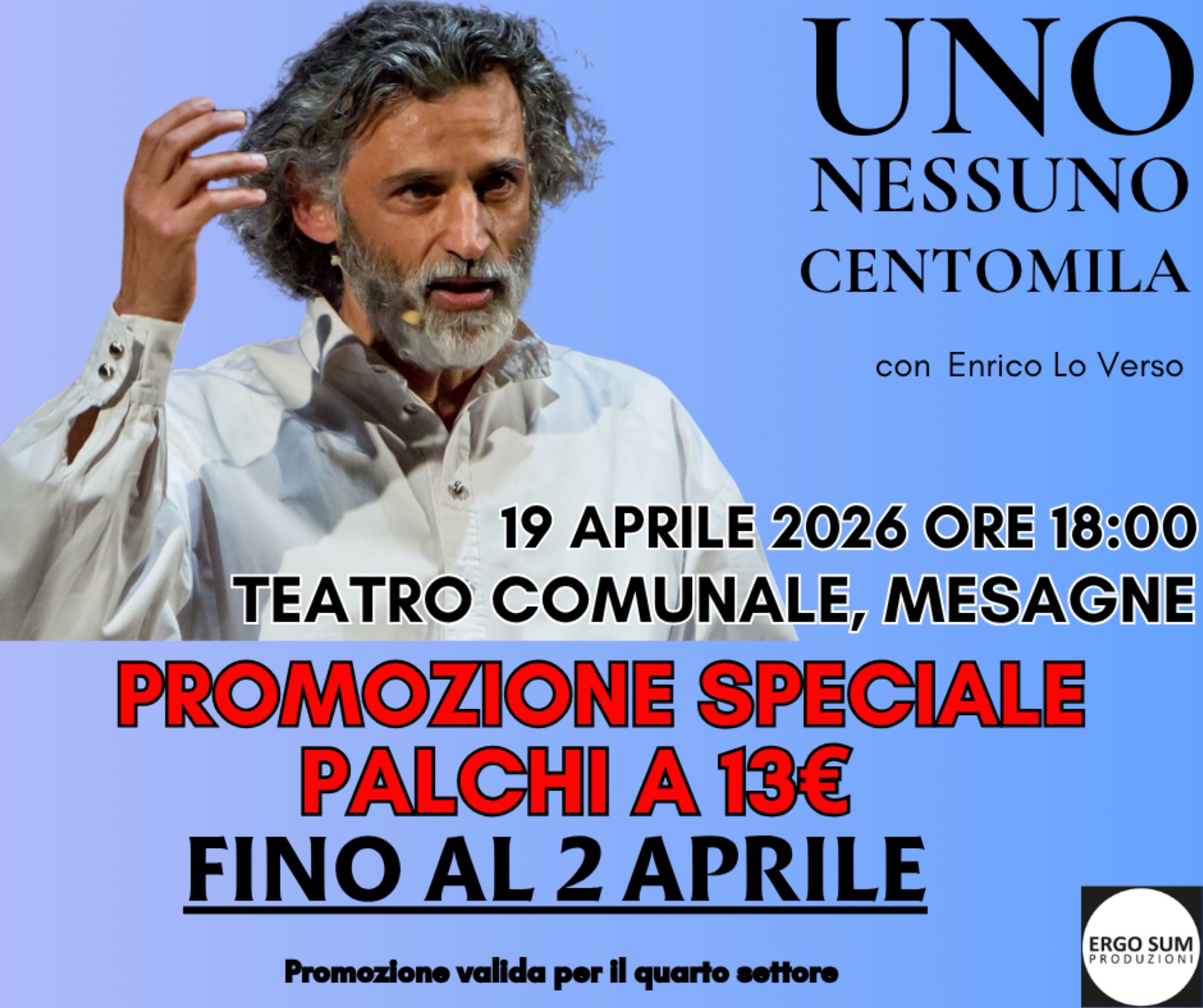 Il Teatro Comunale di Mesagne (BR), ospiterà Domenica19 Aprile alle Ore 18:00, il terzo appuntamento della rassegna “Essere Umani”.  Lo spettacolo “Uno Nessuno Centomila” basato sul celebre omonimo libro di Luigi Pirandello e interpretato dall’attore  Enrico Lo Verso, con regia di Alessandra Pizzi.
