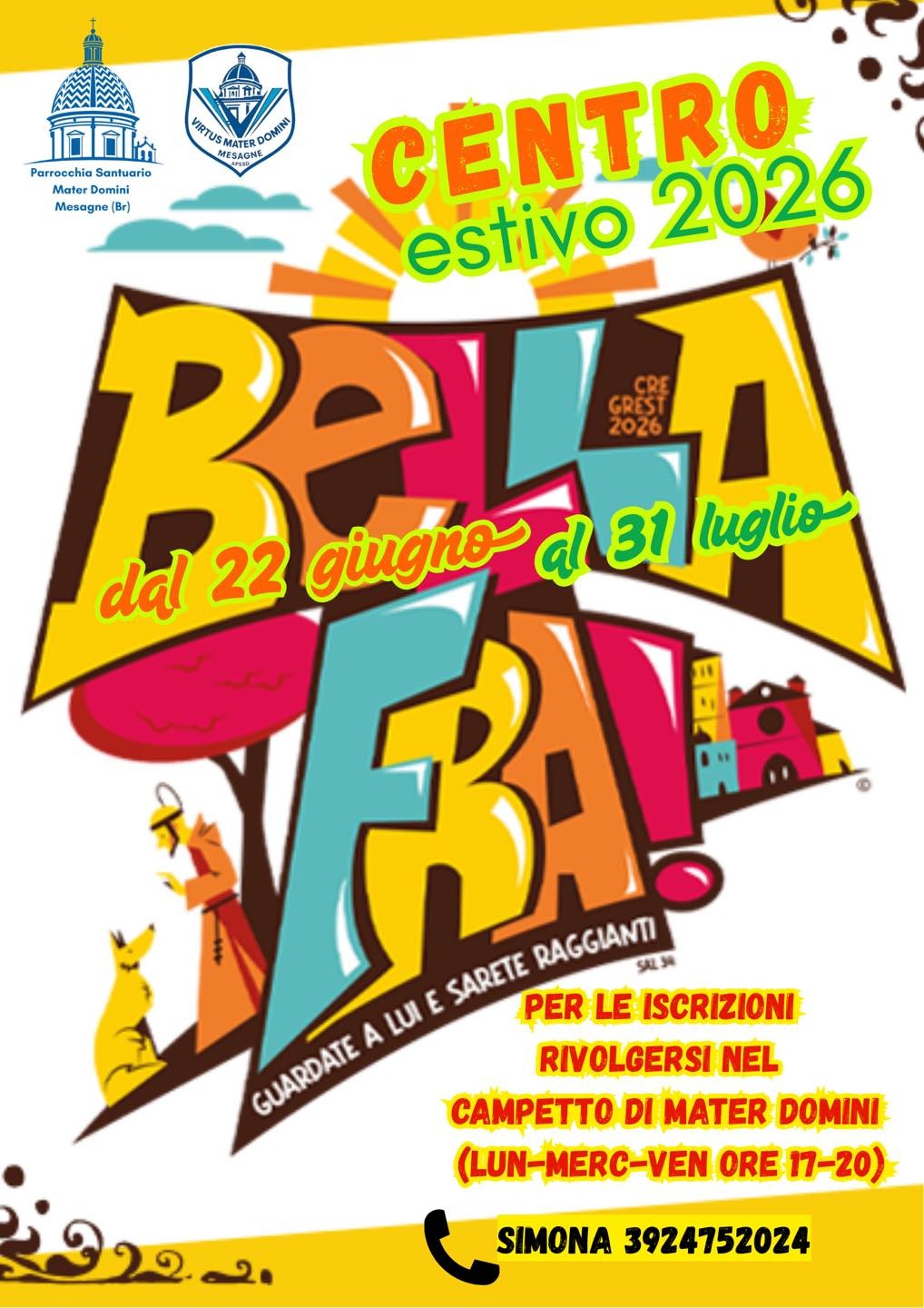 La Parrocchia Santuario Mater Domini, in collaborazione con l’APSSD Virtus Mater Domini, è lieta di annunciare l’apertura delle iscrizioni per il Centro Estivo 2026, intitolato quest’anno “BELLA FRA!”.