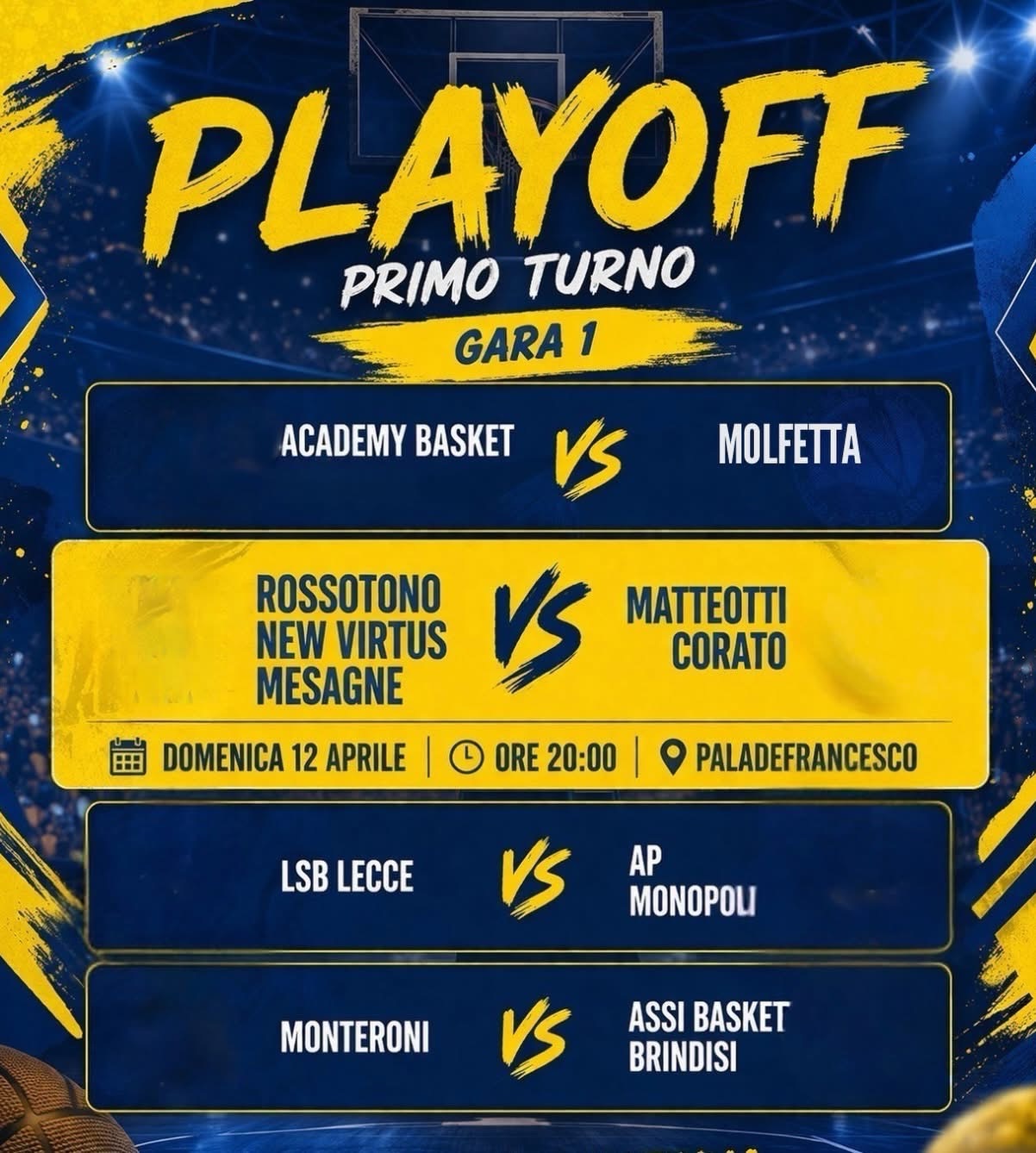 Per la Rossotono New Virtus Mesagne inizia l’avventura dei playoff. Domenica 12 aprile, alle ore 20, è in programma gara 1 contro il Corato. Il Pala De Francesco accoglierà la sfida contro i baresi dopo la partita del volley maschile.