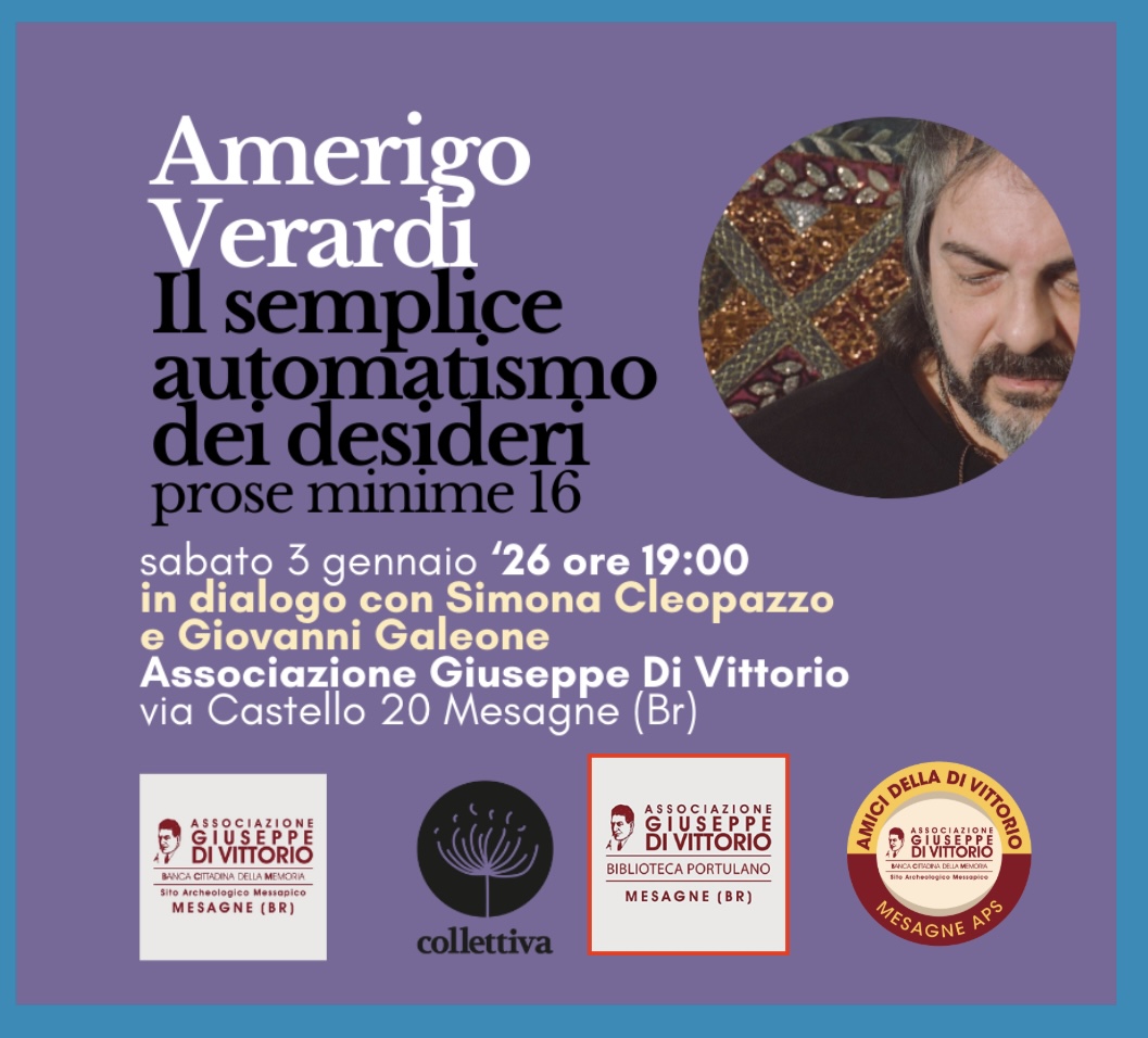Simona Cleopazzo e Giovanni Galeone saranno in dialogo con Amerigo Verardi, autore del libro “Il semplice automatismo dei desideri” edito da Collettiva Edizioni Indipendenti nella collana “prose minime”