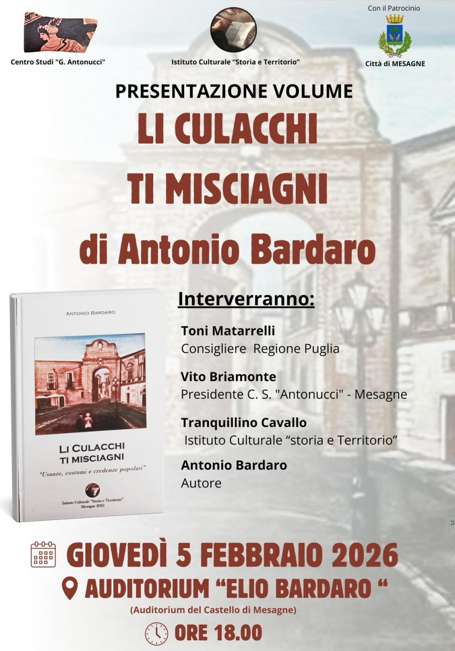Promessa mantenuta: Antonio Bardaro presenta il secondo volume di “Li Culacchi ti Misciagni”. Il prossimo 5 febbraio alle ore 18, presso l’auditorium del castello intitolato al fratello Elio, indimenticabile sindaco di Mesagne, Antonio Bardaro sarà protagonista di un evento imperdibile: la presentazione del suo secondo volume di “Li Culacchi ti Misciagni”. Un’opera che invita a intraprendere un viaggio affascinante e commovente nel cuore pulsante di Mesagne. Questo volume non è semplicemente una raccolta di aneddoti, ma un mosaico di storie, leggende e ricordi che disegna il ritratto vivido di una comunità, delle sue tradizioni e dei suoi personaggi indimenticabili. Attraverso le pagine di Bardaro, si riscopre la dignità della memoria e la ricchezza di un tempo che, sebbene distante, continua a respirare nei vicoli e nelle piazze del borgo.