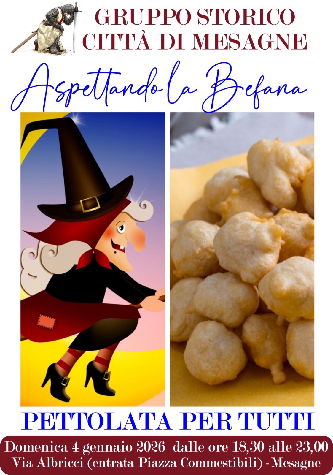 Il Gruppo Storico Città di Mesagne invita cittadini e visitatori a vivere un pomeriggio di festa e tradizione con “Aspettando la Befana – Pettolata per tutti”, un appuntamento pensato per riscoprire i sapori e l’atmosfera autentica della nostra comunità. Domenica 4 gennaio 2026, dalle 18.30 alle 23.00, via Albricci si animerà di profumi e sorrisi, con le immancabili pettole appena fritte, simbolo di convivialità e condivisione.