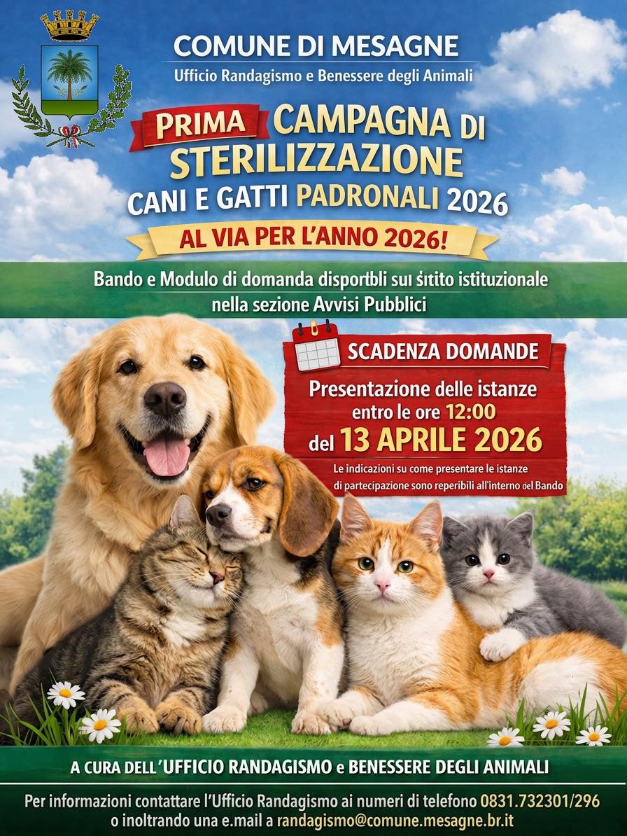 Per contrastare il randagismo e prevenire le nascite incontrollate, anche di animali padronali lasciati liberi, il Comune di Mesagne promuove per il 2026 la Prima Campagna di Sterilizzazione Gratuita rivolta a cani e gatti dei residenti. Gli interventi saranno effettuati presso gli studi veterinari convenzionati, individuati tramite apposito Avviso Pubblico.