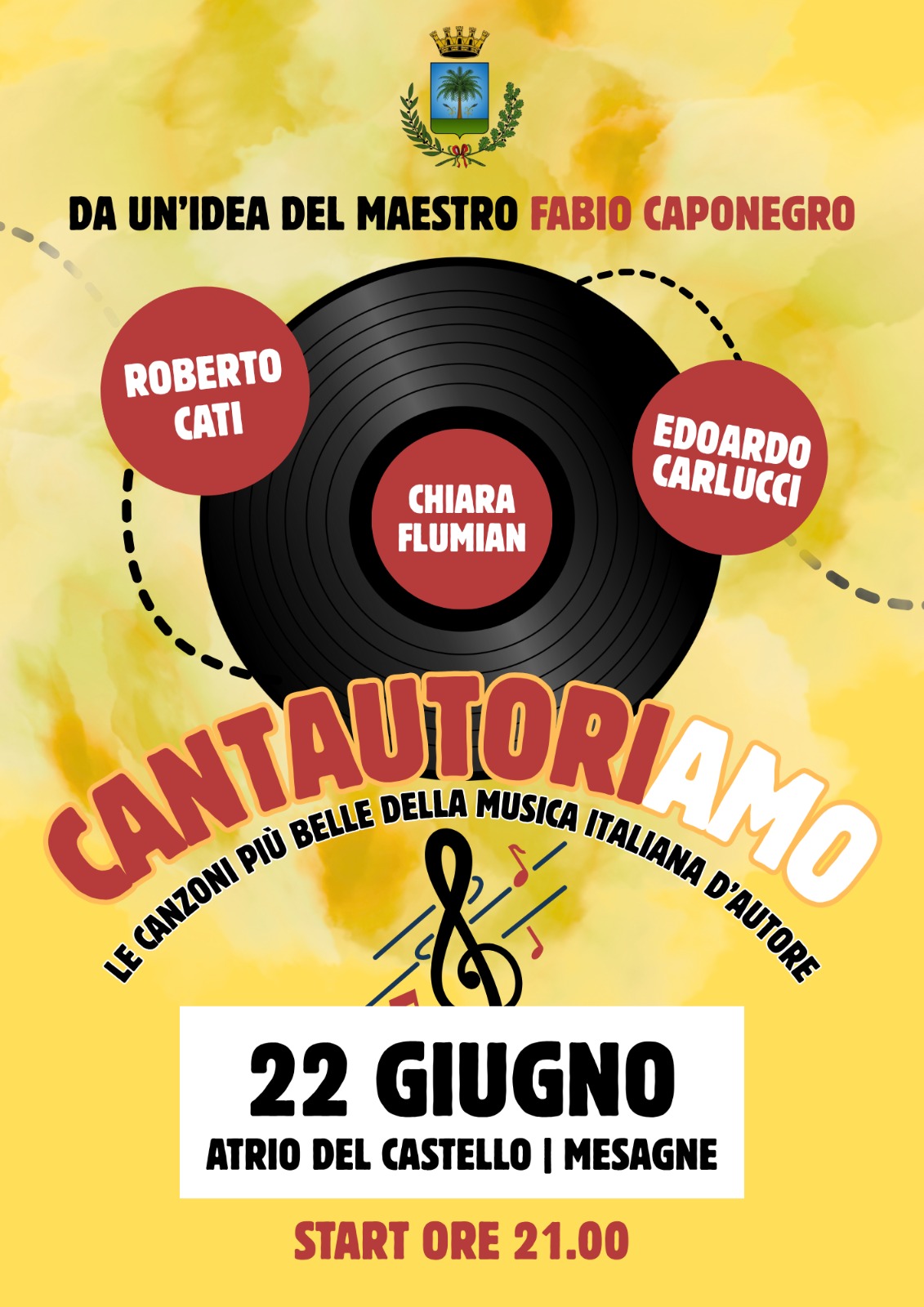 Domani, domenica 22 giugno alle ore 21, l’atrio del Castello Normanno-Svevo di Mesagne si trasformerà in un suggestivo palcoscenico sotto le stelle per ospitare la seconda edizione di CantautoriAmo, il concerto ideato e organizzato dal Maestro Fabio Caponegro.