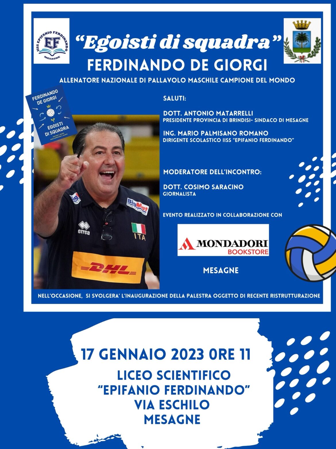 L’IISS “Epifanio Ferdinando” di Mesagne organizza mercoledì 17 gennaio, alle ore 11:00, nella Palestra del Liceo scientifico in via Eschilo a Mesagne, l’incontro-dibattito di presentazione del libro “Egoisti di squadra-Esaltare …