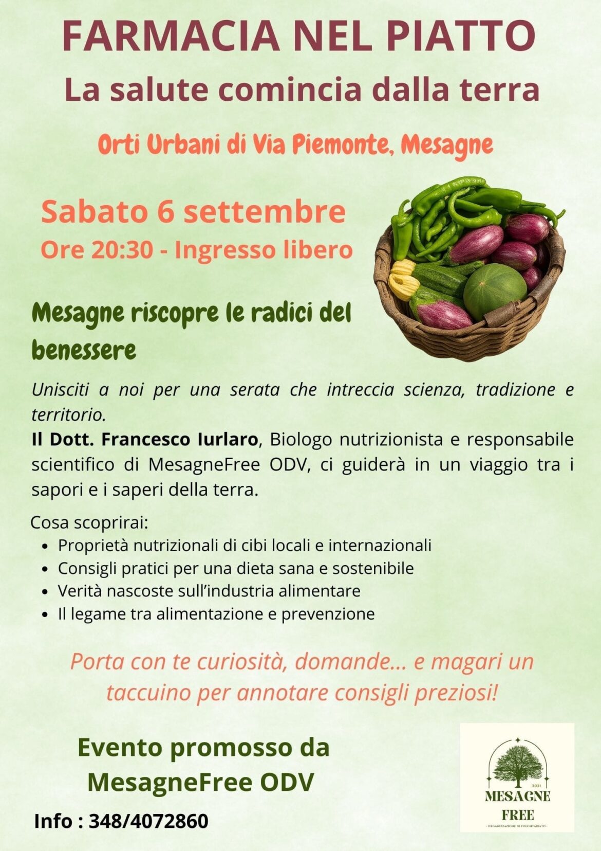 Mesagne riscopre le radici del benessere con un evento che unisce scienza, tradizione e territorio. Sabato 6 settembre, alle ore 20:30, gli Orti Urbani di Via Piemonte ospiteranno la conferenza …