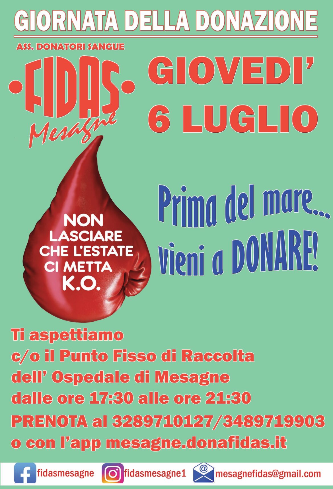 GIOVEDI’ 6 LUGLIO raccolta di sangue organizzata da FIDAS MESAGNE presso il PFR dell’Ospedale “San Camillo de Lellis”, dalle 17:30 alle 21:30. Invitiamo i donatori periodici ed anche coloro che …