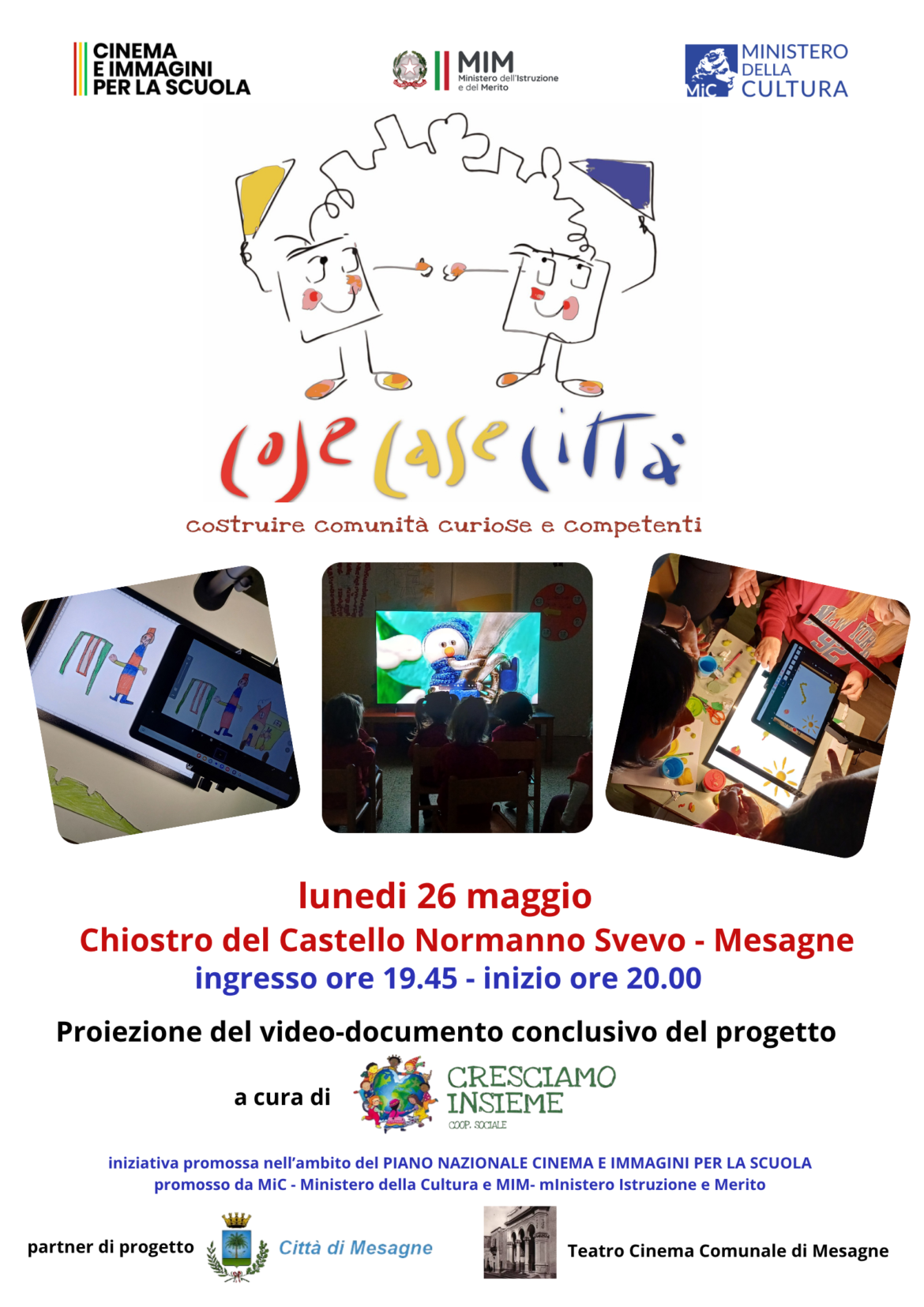 Oggi 26 maggio con ingresso alle ore 19.45, presso il Chiostro del Castello di Mesagne, si terrà la presentazione del video documento che narra le attività realizzate dai bambini e …