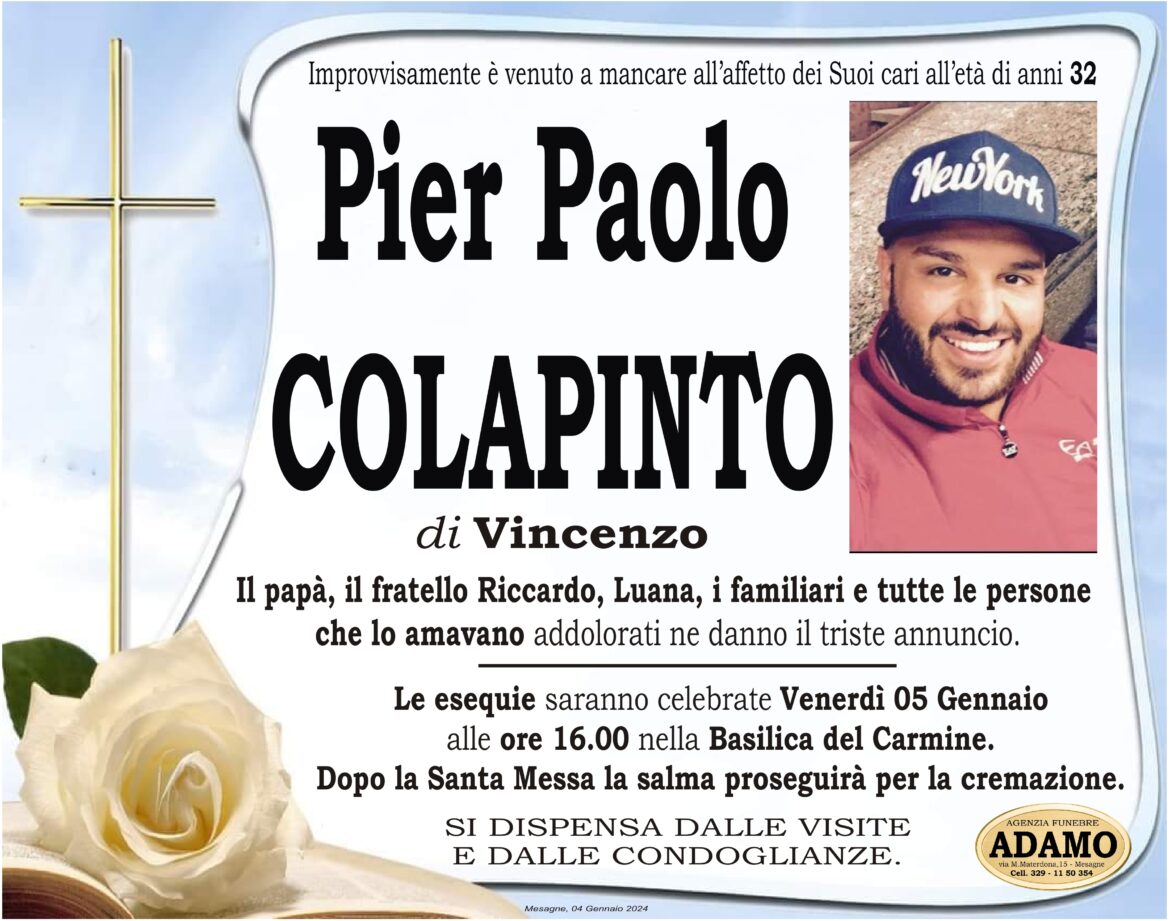 Le Autorità Giudiziarie hanno riconsegnato la salma di Pier Paolo Colapinto alla famiglia. Domani pomeriggio, nella Basilica del Carmine, si svolgeranno i funerali del cuoco 32enne mesagnese morto il giorno …