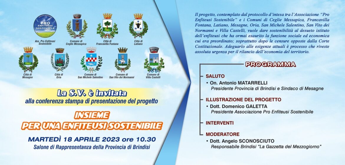 Sarà presentato in conferenza stampa il 18 aprile 2023 alle ore 10,30 presso il Salone di Rappresentanza della Provincia di Brindisi il progetto “Insieme per una enfiteusi sostenibile” a cui …