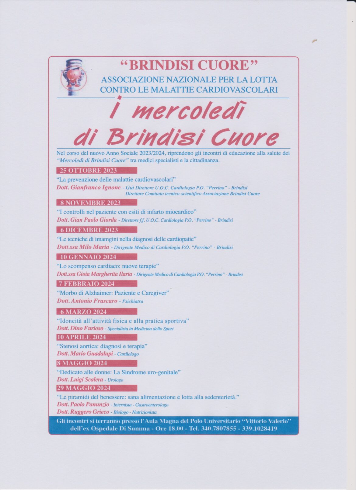 Mercoledì 6 p.v., ore 18.00 presso la sede di “BRINDISI CUORE” (Aula Magna “V. Valerio” del Polo Universitario ASL BR, ex OSPEDALE DI SUMMA), avrà luogo il consueto appuntamento mensile del …