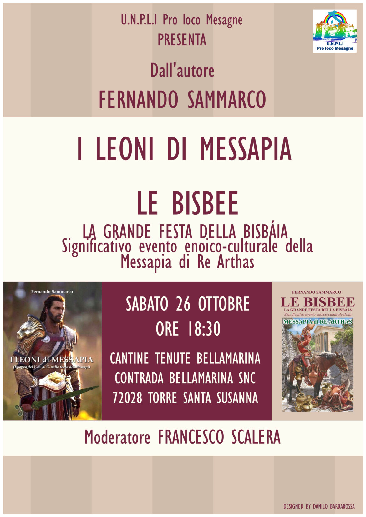 L’associazione turistica e culturale Pro Loco di Mesagne organizza, per sabato 26 ottobre presso le Cantine Tenute Bellamarina, contrada Bellamarina snc (72028 Torre Santa Susanna), la presentazione di due volumi …