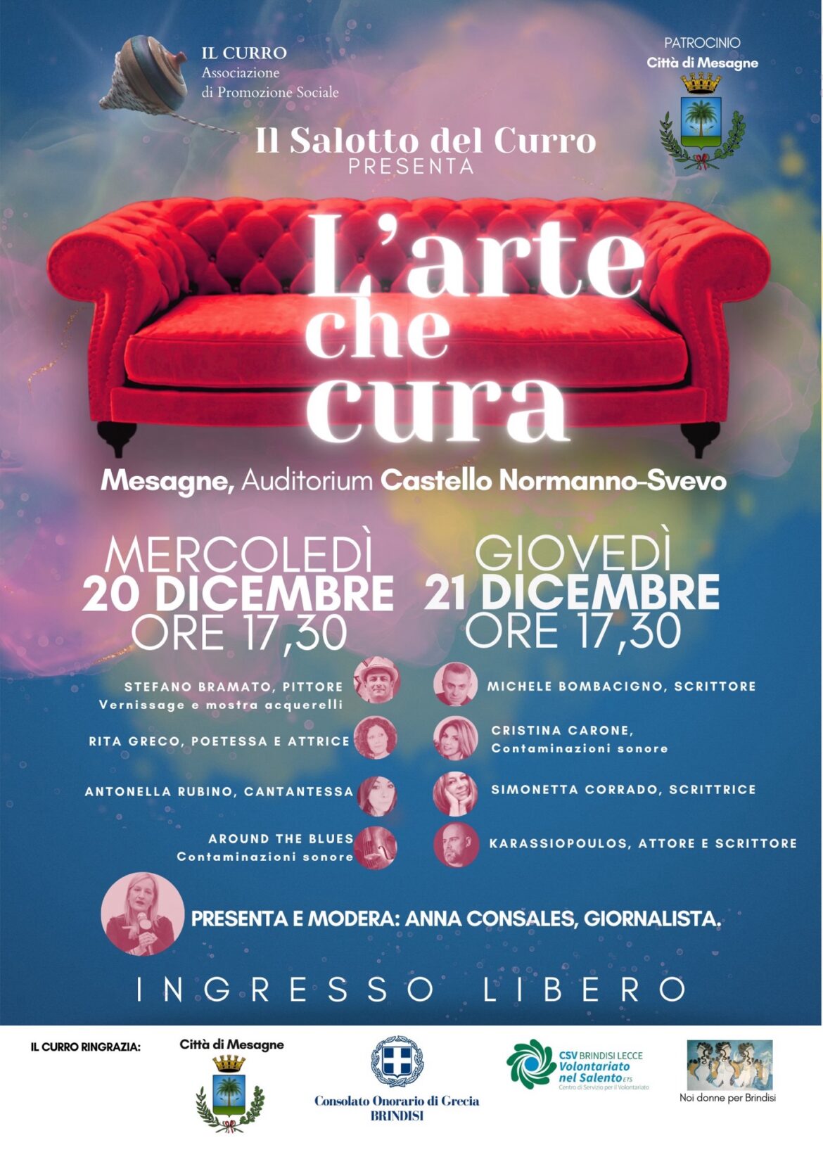 IL SALOTTO DEL CURRO con il patrocinio della Città di Mesagne è lieta di presentare l’evento “L’ARTE che CURA” che si svolgerà presso l’Auditorium del Castello Normanno-Svevo a Mesagne (BR) …