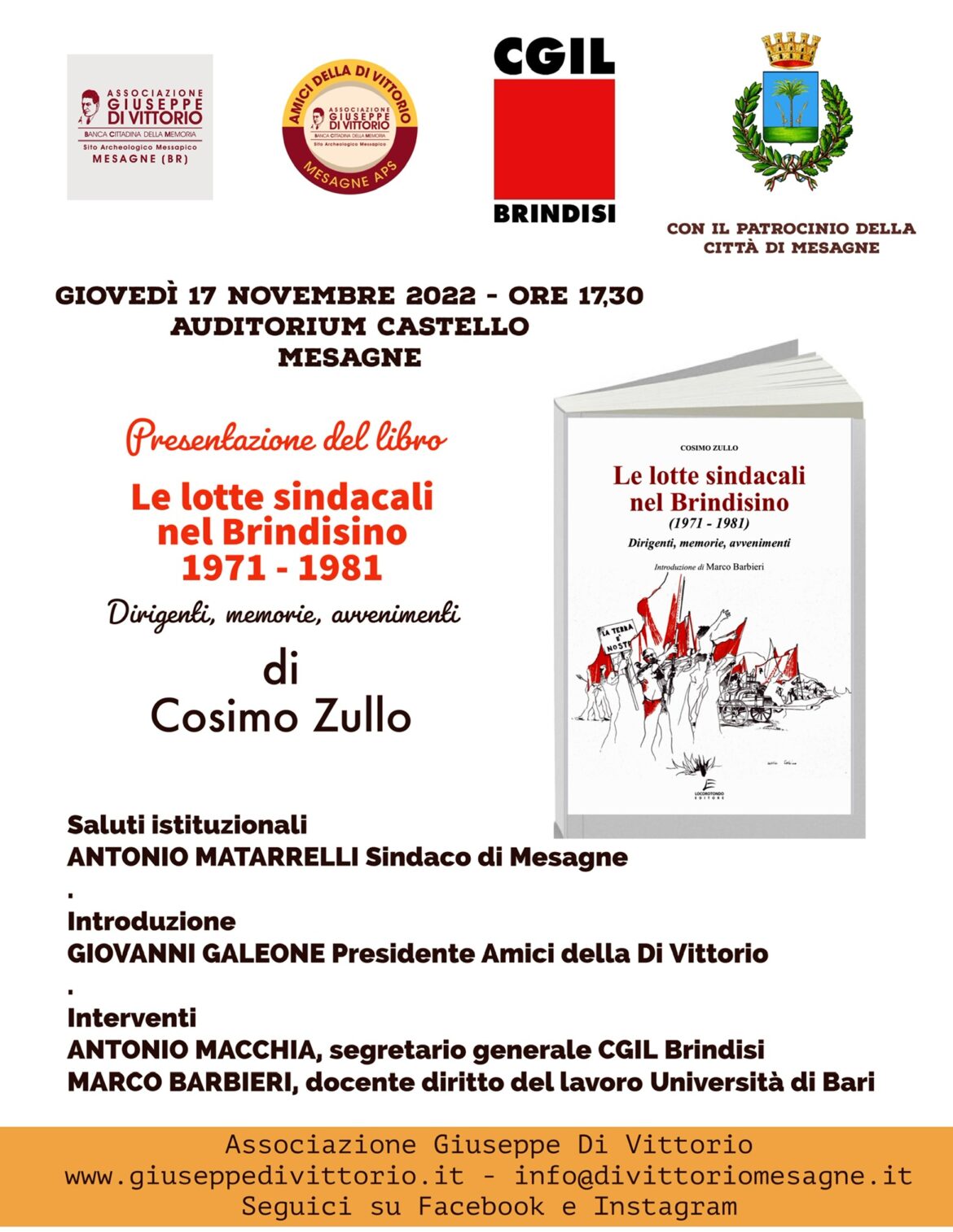 Giovedì 17 novembre, alle ore 17,30, presso l’Auditorium del Castello di Messgne, sarà presentato il libro LE LOTTE SINDACALI NEL BRINDISINO 1971 – 1981 (Locorotondo Editore) di Cosimo Zullo, già …
