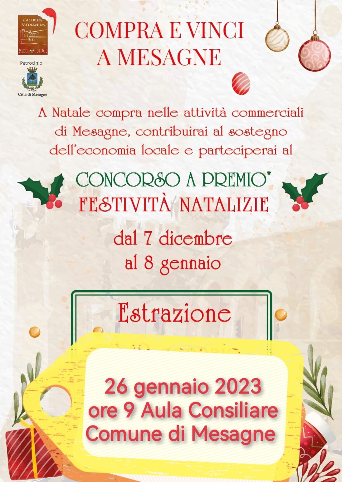 E’ arrivato il giorno tanto atteso da chi ha in mano un biglietto del concorso a premi natalizio. Domani, giovedì 26 gennaio ore 9 Aula Consiliare, estrazione biglietti vincenti “Compra …