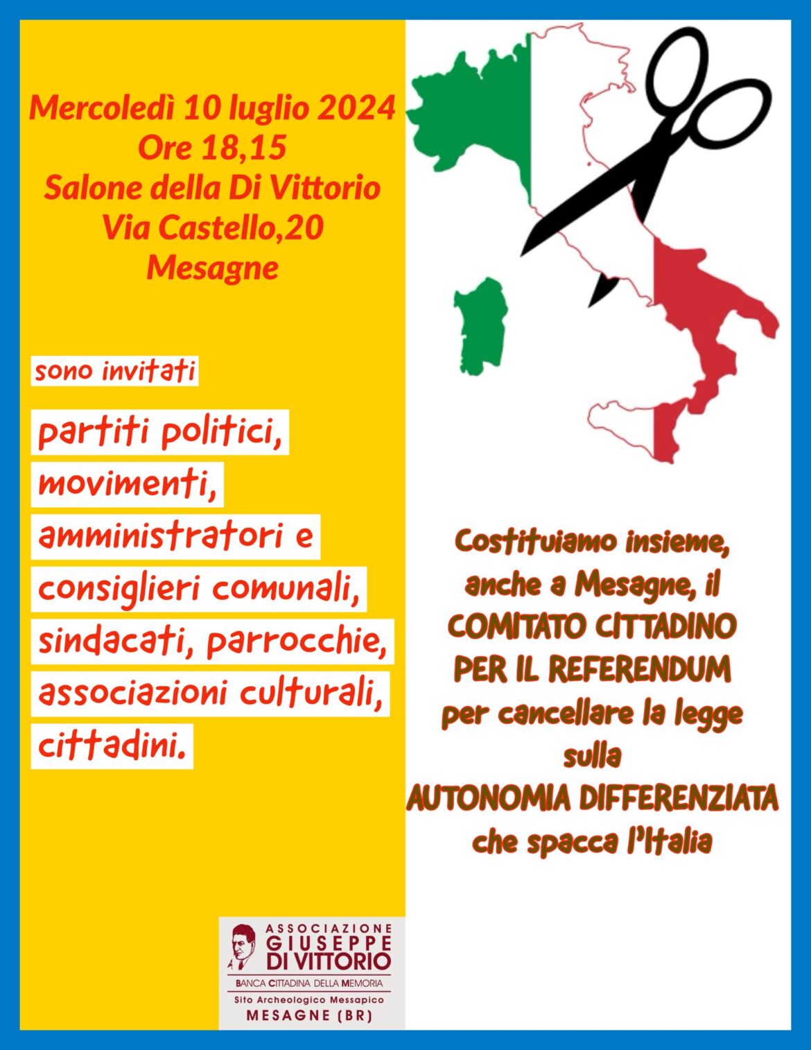 Questa sera (Mercoledì 10 luglio 2024) alle ore 18,15, appuntamento alla “Di Vittorio” per costruire anche a Mesagne il COMITATO CITTADINO PER IL REFERENDUM PER CANCELLARE LA LEGGE SULLA AUTONOMIA …