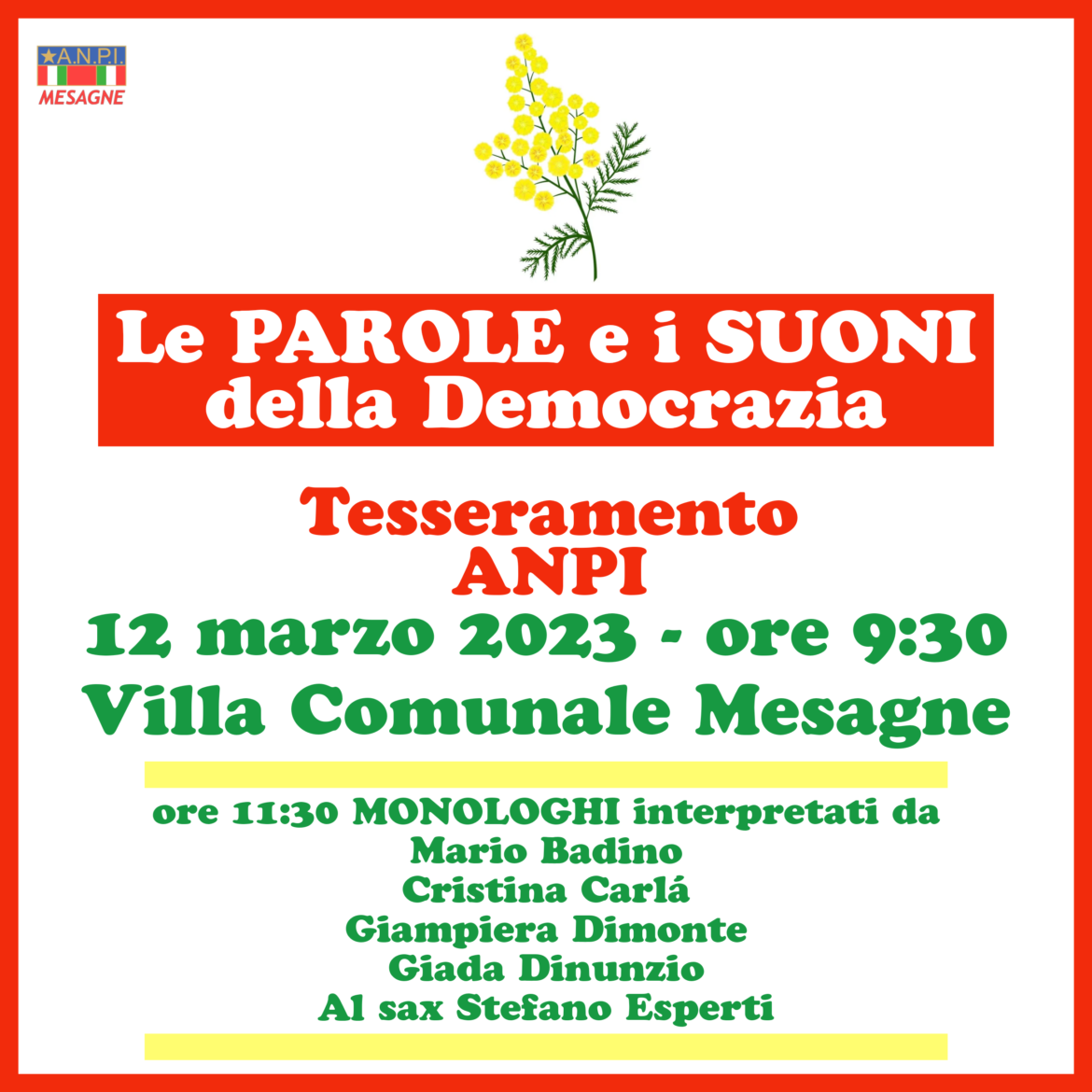 domenica 12 marzo 2023 i soci Anpi , a partire dalle ore 9:30, si ritroveranno in Villa Comunale. Dalle ore 11:00 ascolteremo <<LE PAROLE E I SUONI DELLA DEMOCRAZIA>>. Mario …
