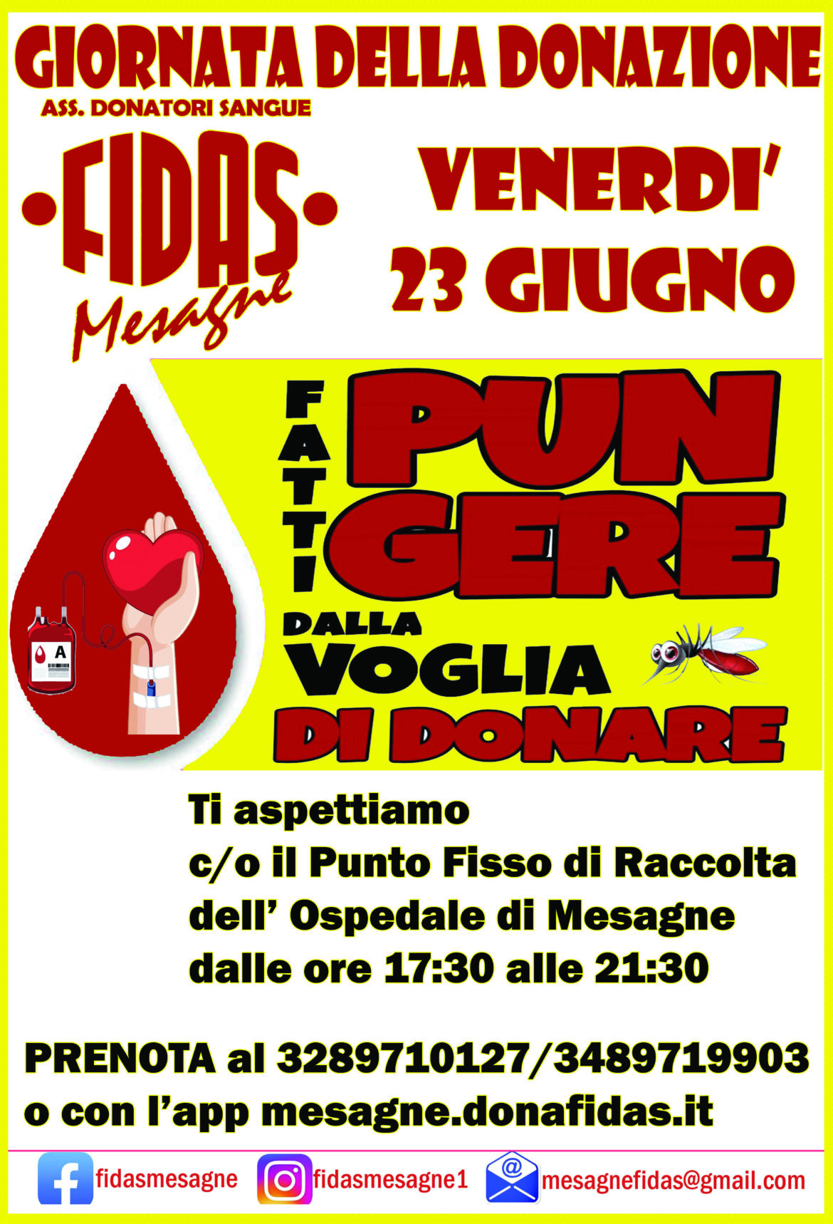 Venerdì 23 Giugno p.v. FIDAS Mesagne organizza una raccolta serale di sangue. Si può donare dalle ore 17:30 alle ore 21:30 presso il PFR dell’Ospedale di Mesagne. I Volontari Fidas …