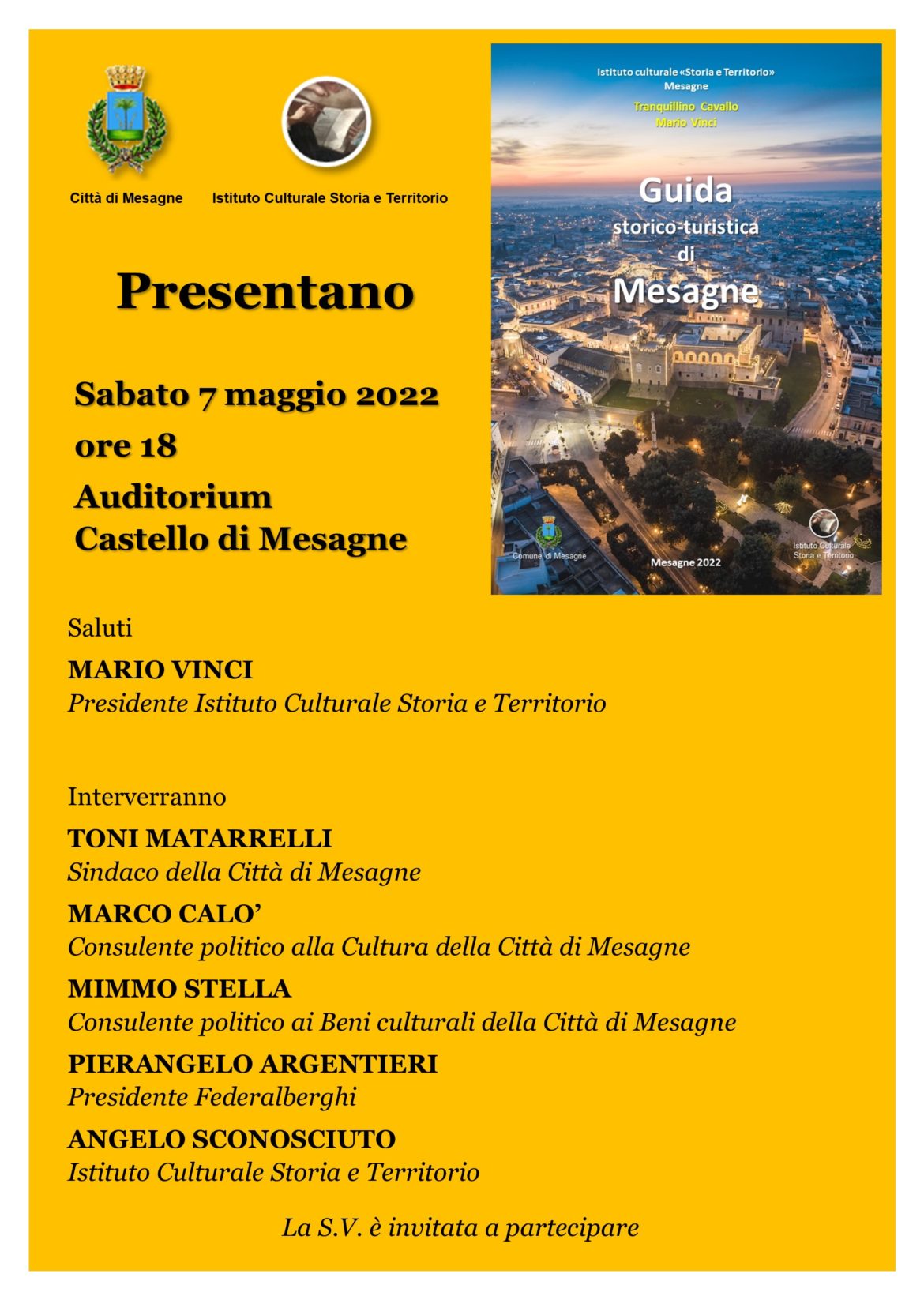 L’istituto culturale ‘Storia e Territorio’ presenta la guida storico-turistica di Mesagne L’iniziativa si svolgerà il prossimo sabato 7 maggio alle ore 18 presso l’Auditorium del Castello comunale “Chi troverà quello …