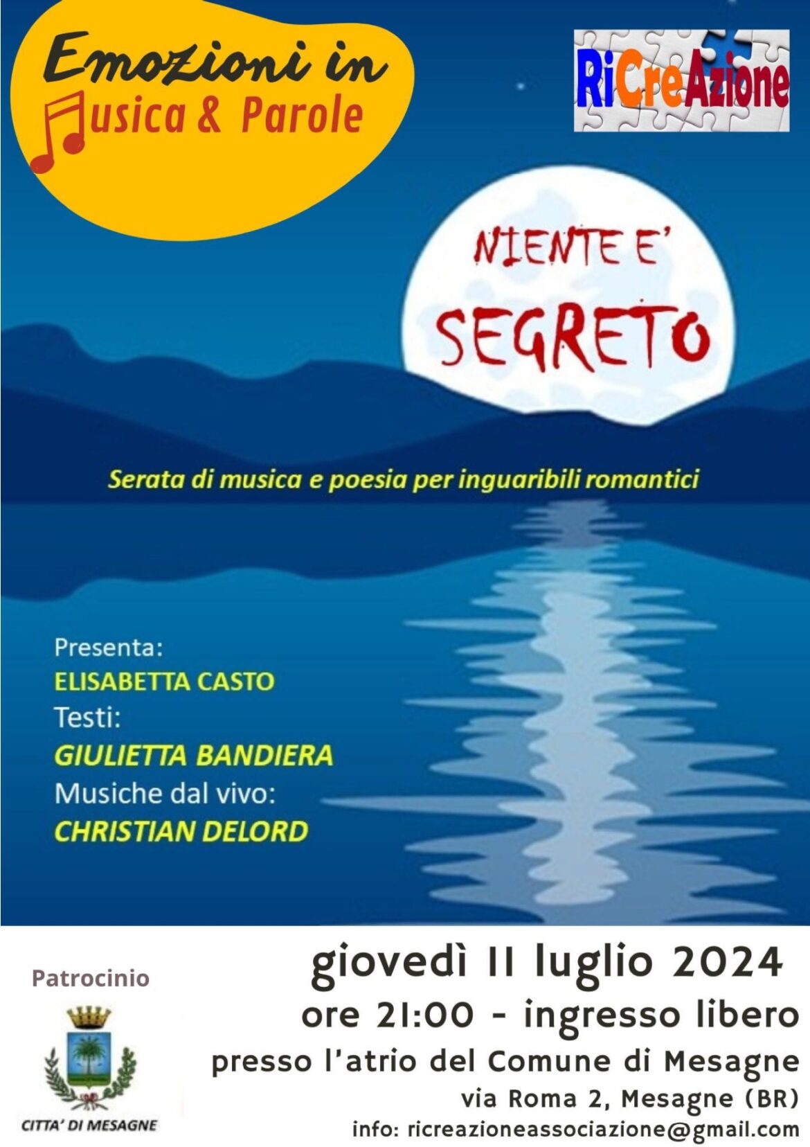 Secondo appuntamento della rassegna “Emozioni in musica e parole” organizzato dall’Associazione RiCreAzione aps di Mesagne. Giovedì 11 luglio 2024 alle ore 21.00 presso l’Atrio (o Chiostro) del Comune di Mesagne si …