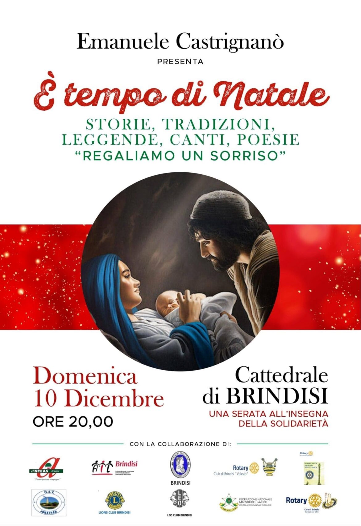 Domenica 10 dicembre ore 20,00nella Cattedrale di Brindisi“Tempo di Natale”Regaliamo un sorrisoSerata di solidarietà con la Caritas parrocchiale.Da un’idea di Emanuele Castrignanò.Musiche e Canti:-Pianoforte e voce: dr. Vincenzo Gatto-Sax: Maestro …