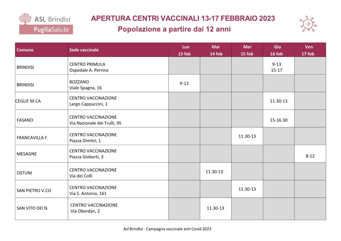 Aggiornamento dei centri attivi nei comuni della provincia di Brindisi per le vaccinazioni anti Covid della popolazione dai 12 anni in su. La somministrazione prosegue con la collaborazione dei medici …