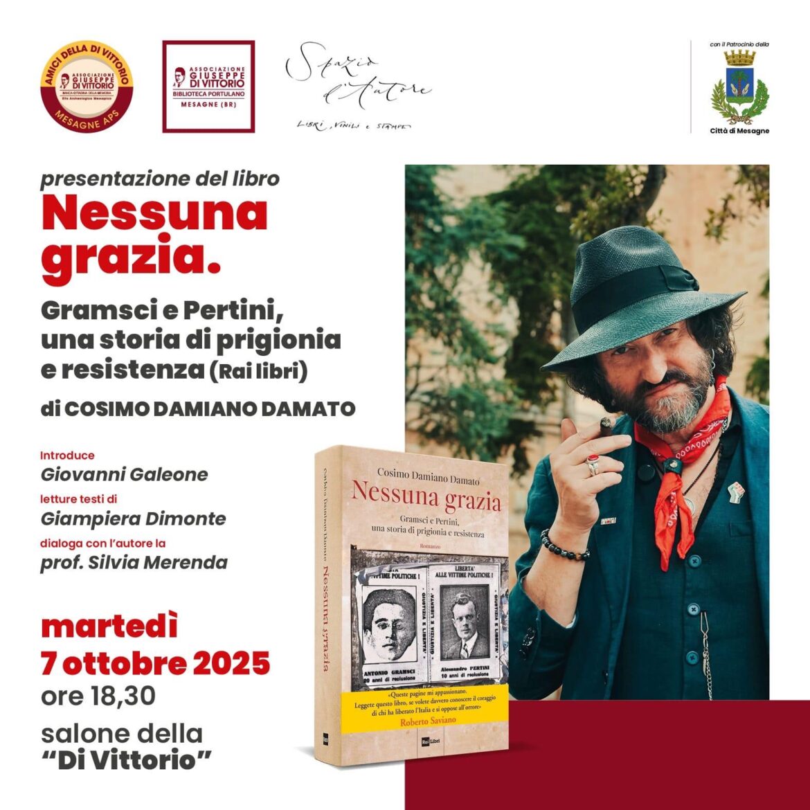 Martedì 7 ottobre 2025 alle 18,30 presso il Salone della “Di Vittorio” – in via Castello 20 a Mesagne – verrà presentato il romanzo storico dal titolo “Nessuna grazia. Gramsci …
