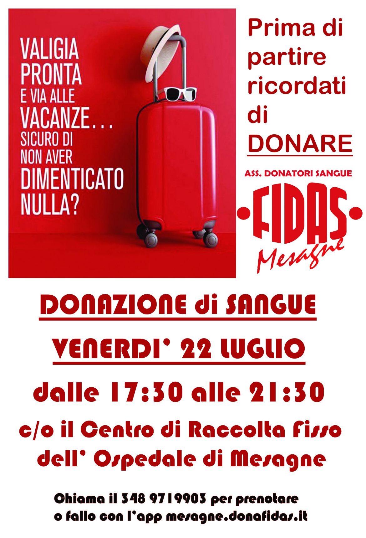 Seconda GIORNATA di DONAZIONE SANGUE del mese di luglio per FIDAS MESAGNE che vi aspetta VENERDI’ 22 LUGLIO p.v., dalle ore 17:30 alle 21:30, presso il Centro di Raccolta dell’Osp. …