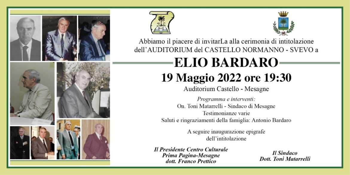 Giovedì 19 maggio 2022 ore 19,30, cerimonia di intitolazione dell’Auditorium del castello Normanno-Svevo alla figura del Sindaco Elio Bardaro. Nel venticinquennale della morte dell’ avv. Elio Bardaro, la Giunta Comunale …