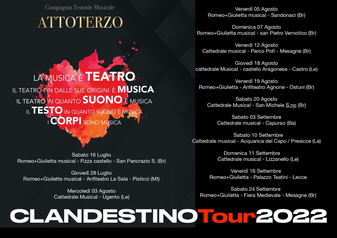 Parte il CLANDESTINOTOUR 2022 Della Compagnia AttoTerzo. Un tour che farà provare grandi emozioni agli artisti mesagnesi che porteranno la loro arte in giro per le piazze di Puglia, Basilicata …