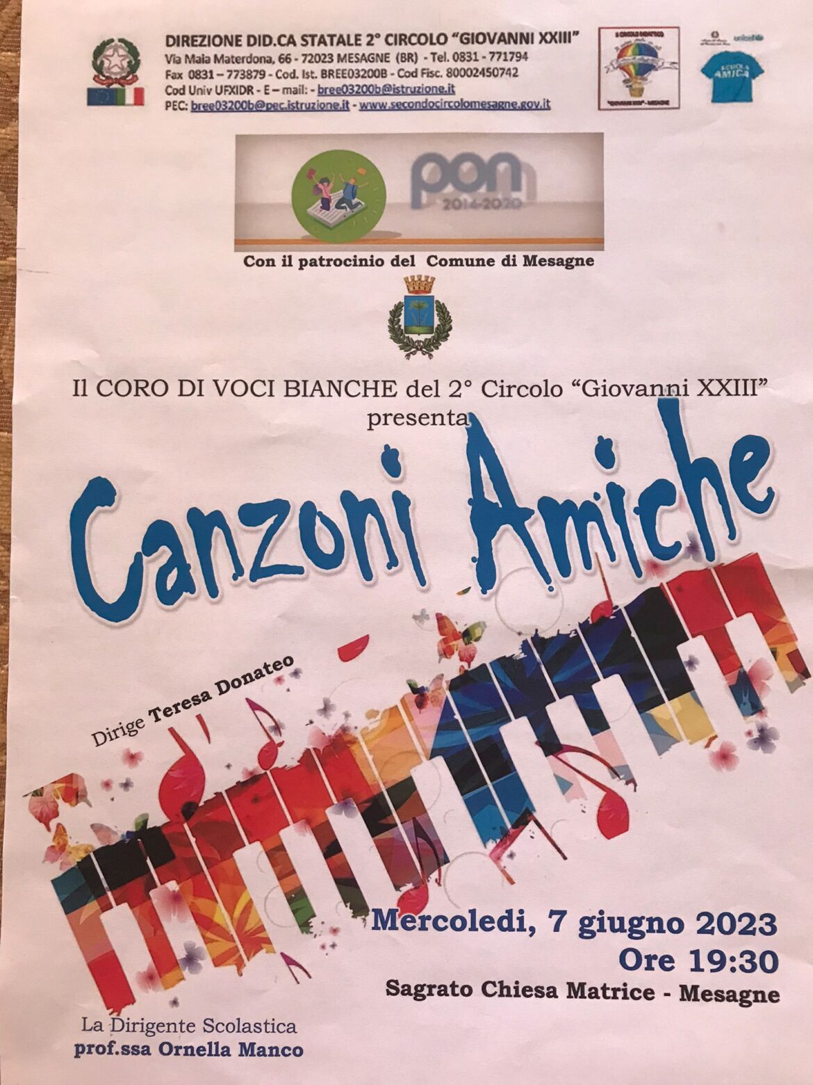 Mercoledì 7 giugno, con inizio alle ore 19.30 sul Sagrato della Chiesa Madre, il Secondo circolo didattico presenta il “Coro diVoci bianche”. Il concerto, dal titolo “Canzoni Amiche”, è il …