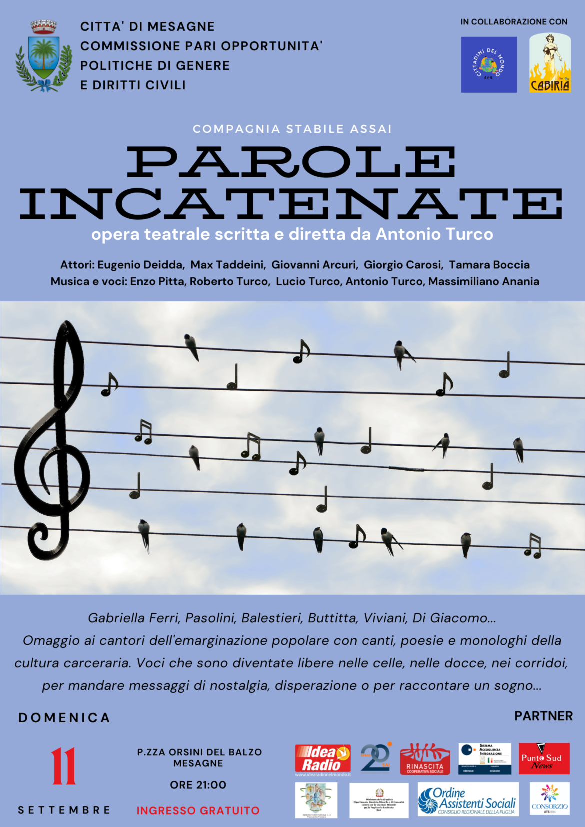 Domenica 11 settembre alle ore 21:00, in piazza Orsini del Balzo a Mesagne (Br), andrà in scena lo spettacolo “Parole Incatenate”, regia di Antonio Turco, con la compagnia romana “Stabile Assai”. L’evento a ingresso gratuito, è un …