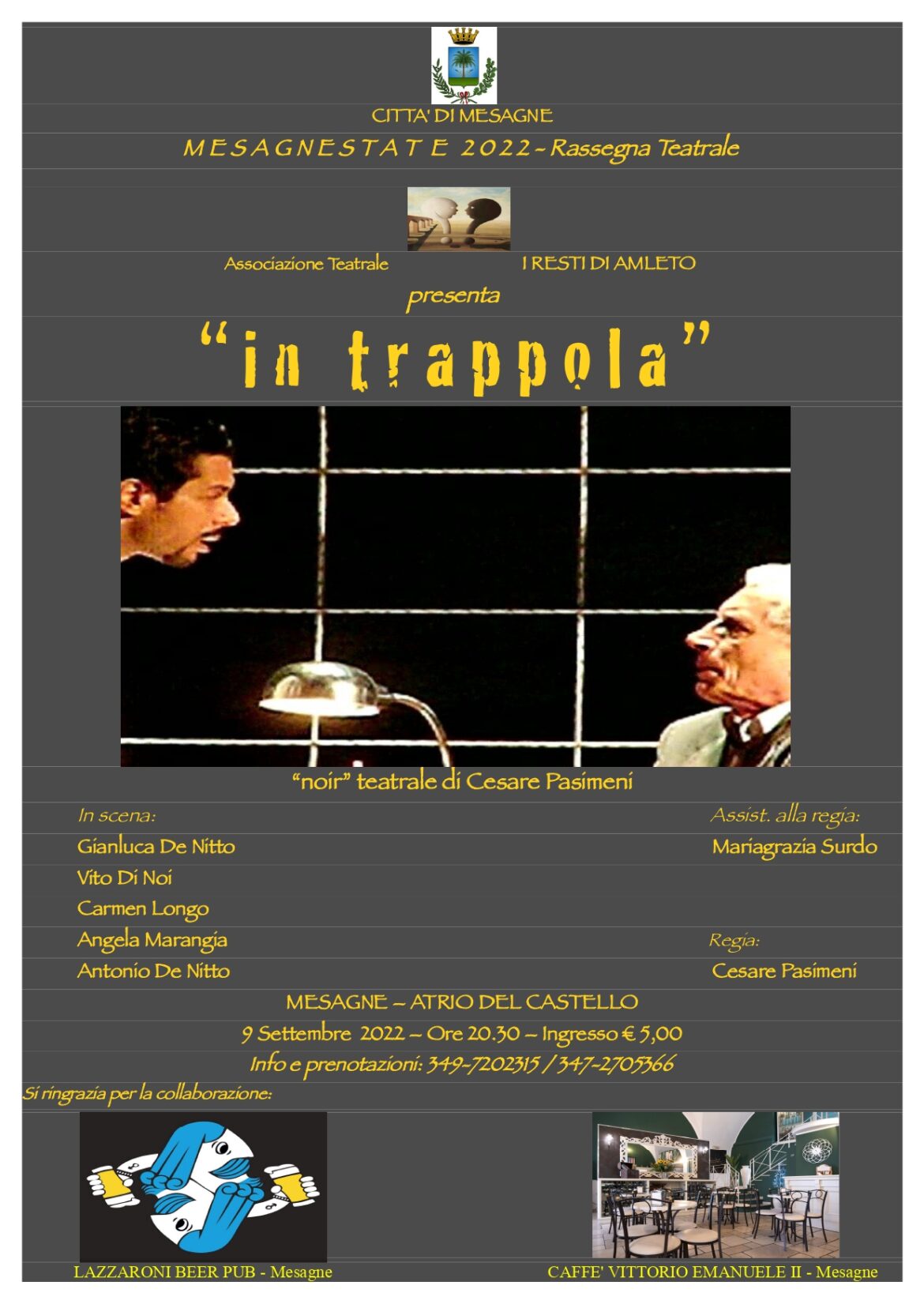 Venerdì 9 Settembre, presso l’Atrio del Castello, va in scena un altro appuntamento con la Rassegna Teatrale inserita nelle manifestazioni di MesagnEstate 2022. Si tratta di “In Trappola”, un “noir” …