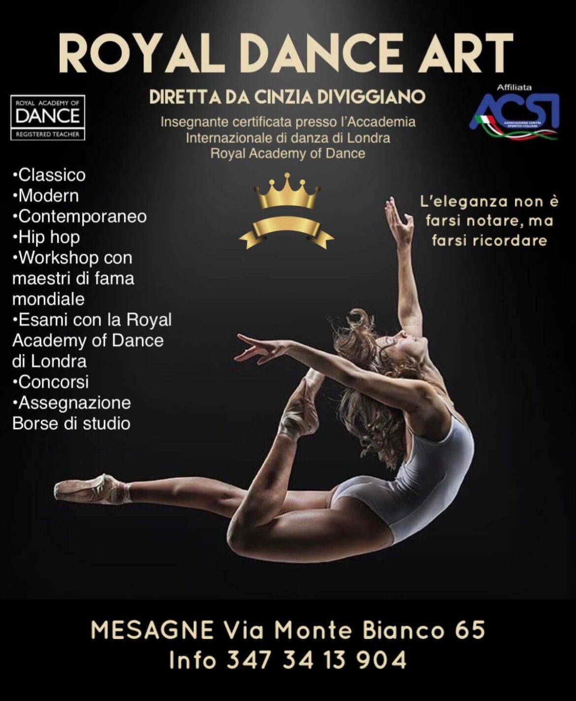 La Scuola di danza Royal Dance Art è un centro professionale di danza classica, modern e contemporanea, fondata nell’anno 1996 da Cinzia Diviggiano insegnante registrata e certificata presso l’Accademia Internazionale …