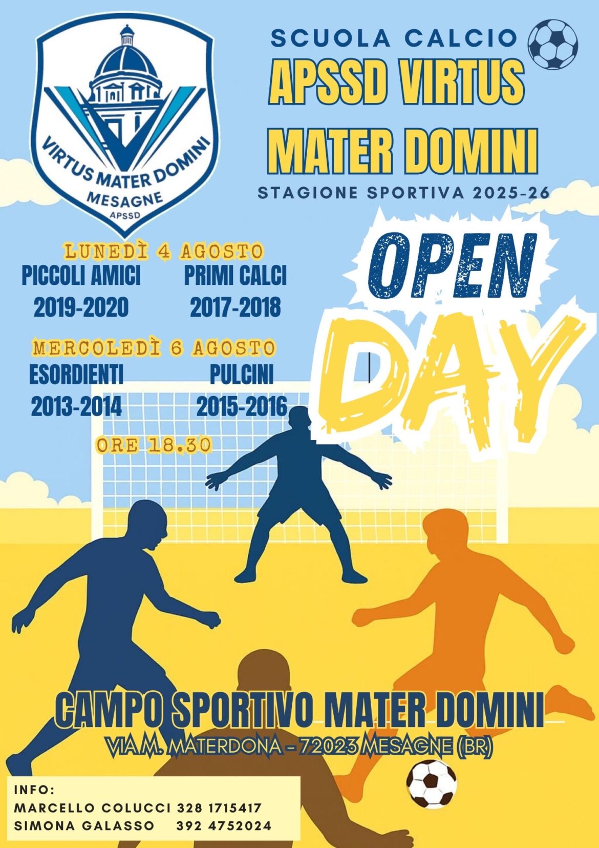 La scuola calcio APSSD Virtus Mater Domini di Mesagne è lieta di annunciare l’Open Day per la stagione sportiva 2025-2026, che si terrà presso il Campo Sportivo Mater Domini (Via …