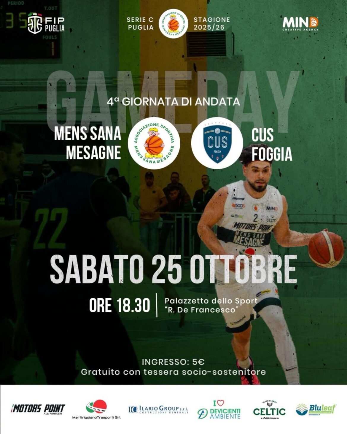 Per la quarta giornata di andata i mesagnesi della Mens Sana ospitano il Cus Foggia. Appuntamento alle ore 18.30 nella palazzetto dello sporto “Raffaele Defrancesco”