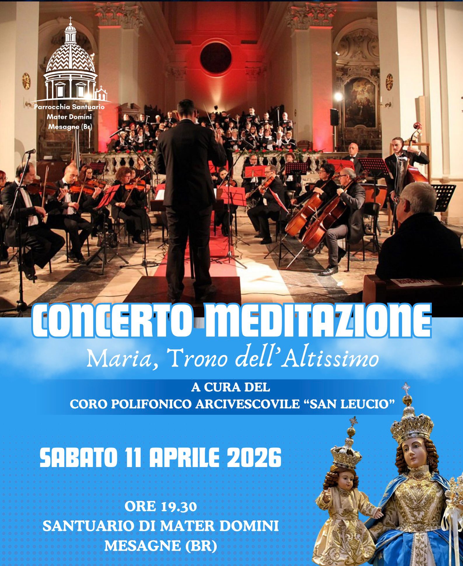 Entrano nel vivo le celebrazioni per la Festa di Mater Domini, uno degli appuntamenti più sentiti e identitari della comunità mesagnese. Tra i momenti più attesi del programma di quest’anno, spicca il Concerto-Meditazione “Maria, Trono dell’Altissimo”, che si terrà sabato 11 aprile alle ore 19.30 presso l’omonimo Santuario.