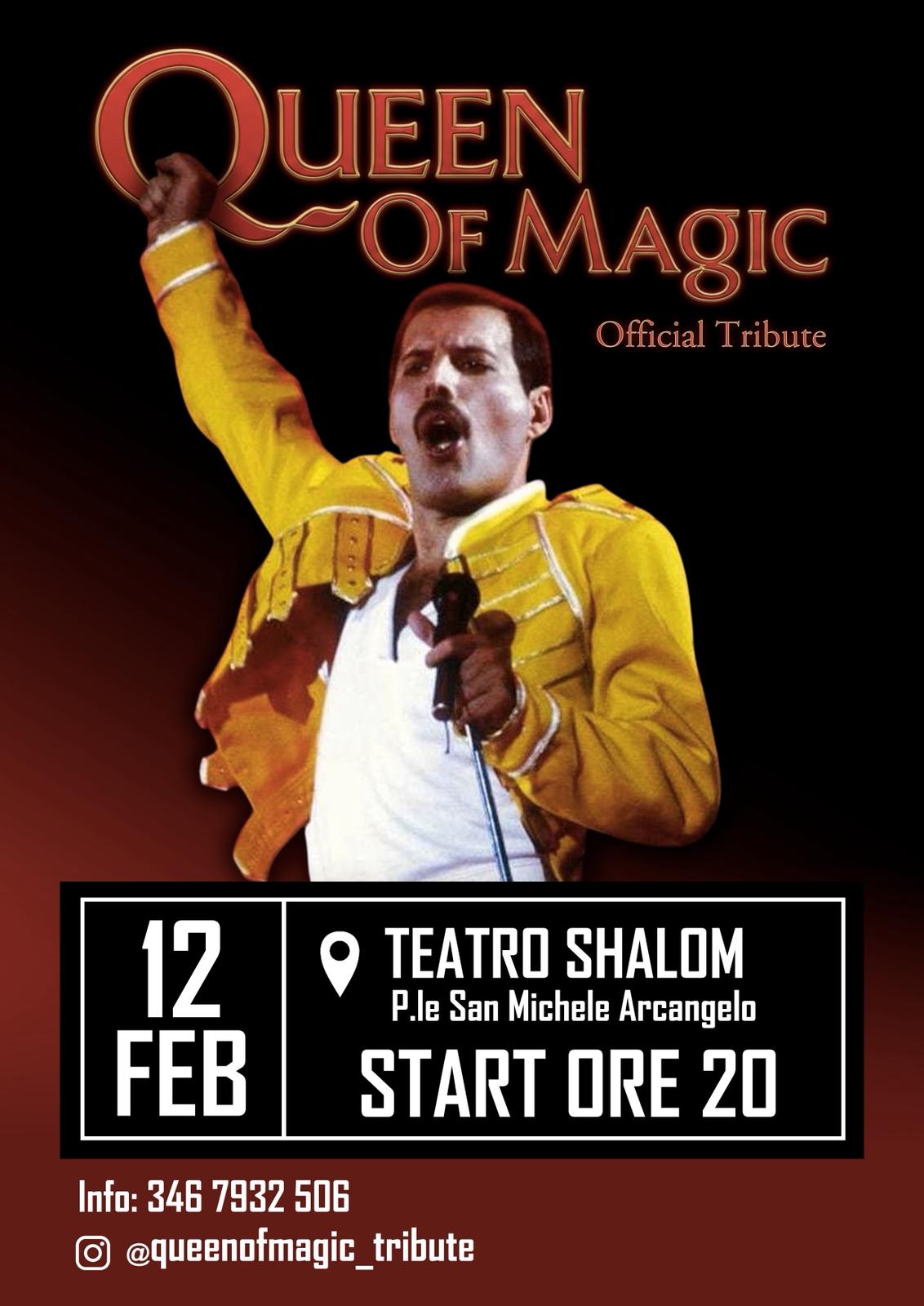 siamo entusiasti di annunciare un evento straordinario che farà vibrare le corde del vostro cuore e riporterà in vita la magia di Freddie Mercury! Il 12 febbraio 2026, alle ore 20, presso il prestigioso Teatro Shalom dei Padri Carmelitani, situato in Piazza San Michele Arcangelo n. 1, avrà luogo un concerto unico nel suo genere, offerto dai talentuosi “Queen of Magic”, ufficiale tribute band dei leggendari Queen.