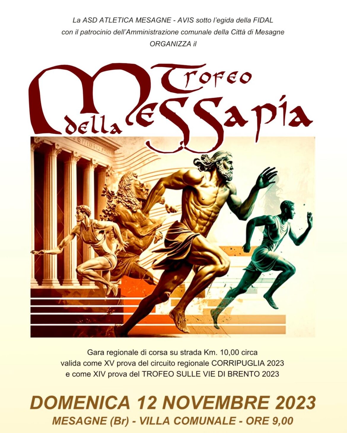Trofeo della Messapia: domenica 12 novembre Mesagne si prepara ad ospitare la tappa dell’evento podistico “Corripuglia”, partenza da via Tenente Ugo Granafei (Villa Comunale) alle ore 9:00. Per le iscrizioni accedere al sito web ufficiale dell’evento all’indirizzo www.corripupuglia.com.