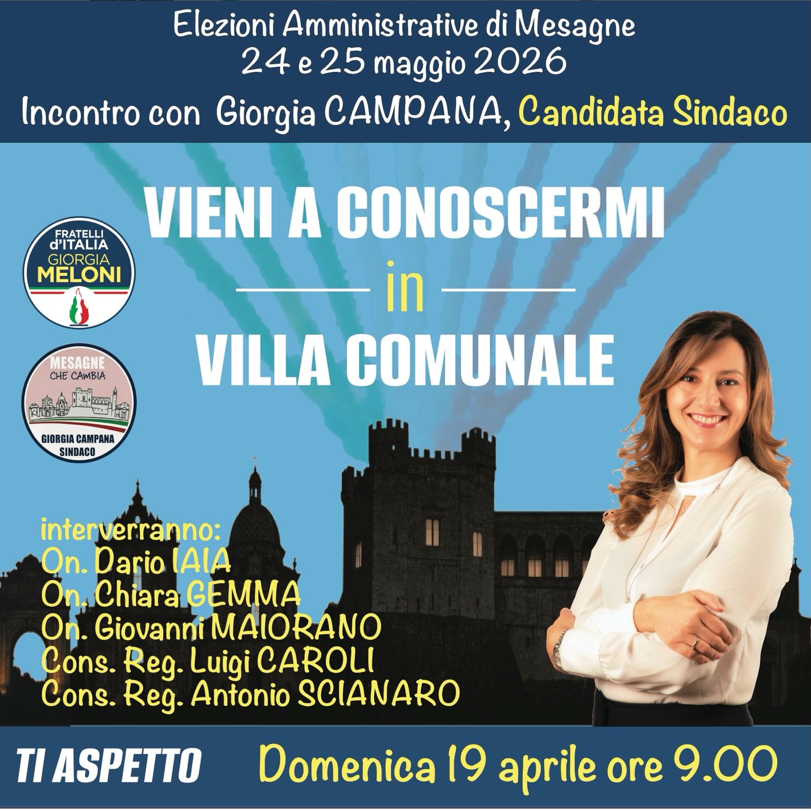 Domenica in villa comunale la candidata sindaca del centrodestra, Gioprgia Campana, invita i cittadini a conoscerla e si dice disponibile ad ascoltare le istanze e i problemi presenti nei quartieri.