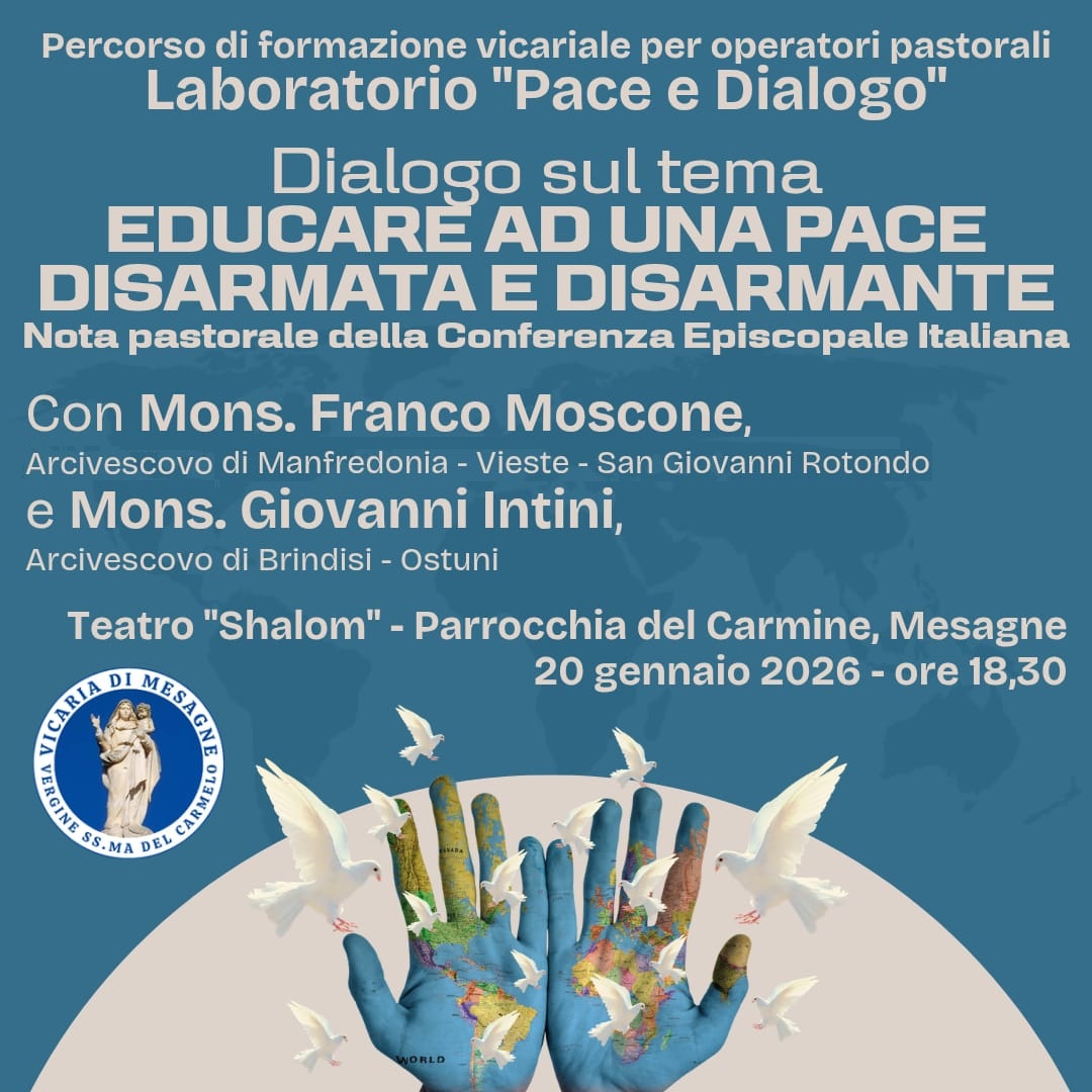 In un’epoca di profonde tensioni globali, la Vicaria di Mesagne promuove un momento di alta riflessione e impegno civile. Martedì 20 gennaio, alle ore 18:30, il Teatro parrocchiale del Carmine ospiterà l’incontro “Educare ad una pace disarmata e disarmante”. L’evento si inserisce nel percorso vicariale “Educare alla pace in tempi di guerra” e prende le mosse dalla Nota pastorale della Conferenza Episcopale Italiana (CEI), documento che richiama la Chiesa a un’azione profetica per il disarmo e la riconciliazione. Il dialogo vedrà il confronto tra due pastori da sempre in prima linea sui temi della giustizia: S. E. Mons. Franco Moscone, Arcivescovo di Manfredonia-Vieste-San Giovanni Rotondo e S. E. Mons. Giovanni Intini, Arcivescovo di Brindisi-Ostuni.