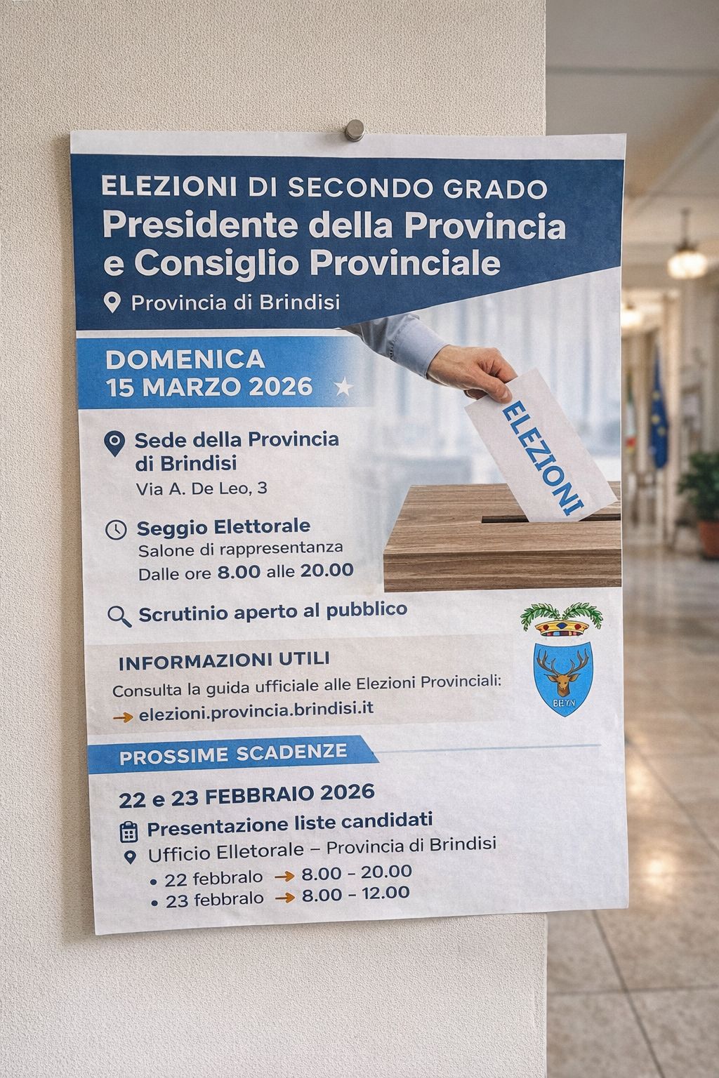 Si informa la cittadinanza che sono in programma le elezioni di secondo livello per l’elezione del Presidente della Provincia e il rinnovo del Consiglio Provinciale di Brindisi: l’appuntamento è per DOMENICA 15 MARZO 2026 presso la sede della Provincia di Brindisi in Via A. De Leo 3.