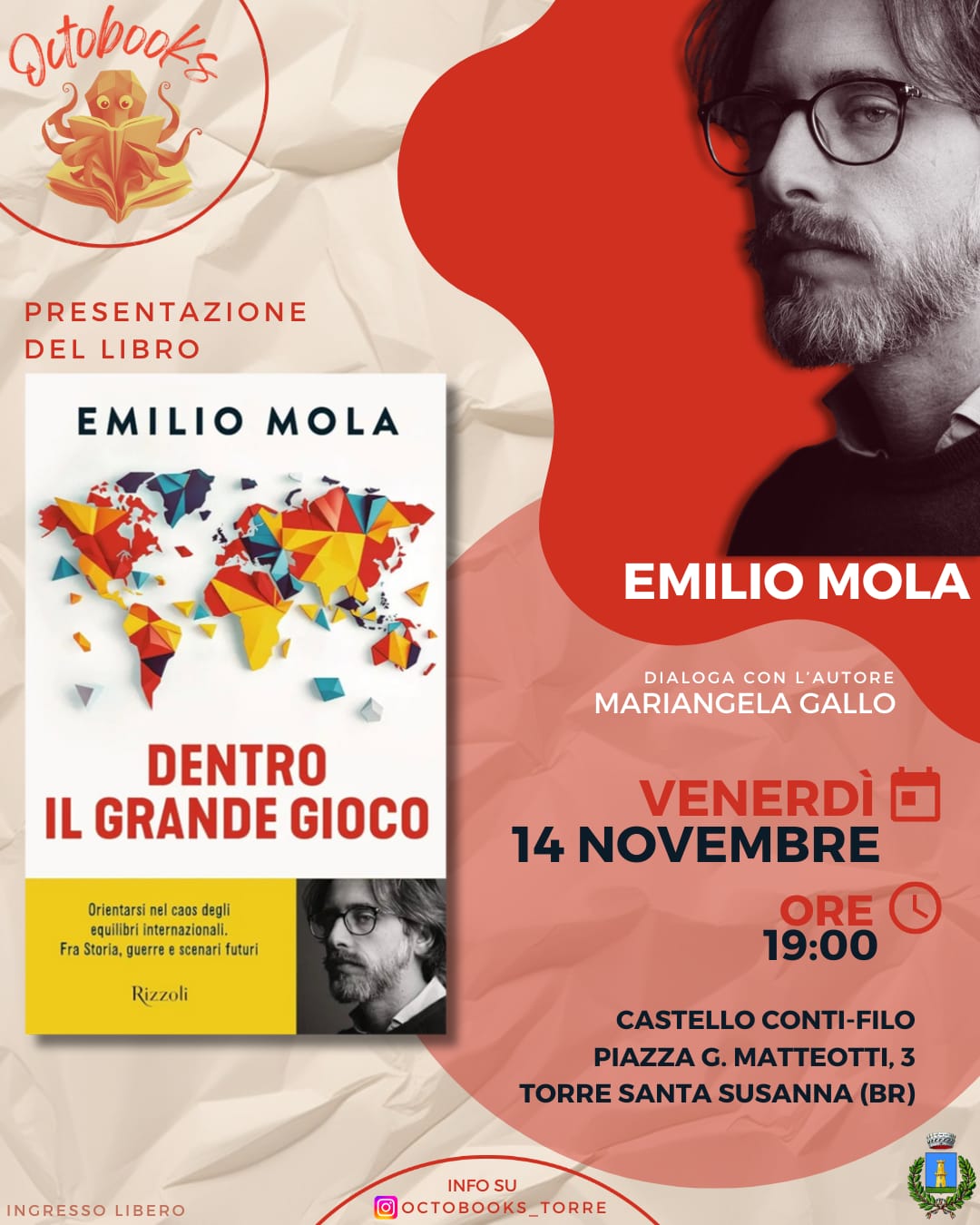 Venerdì 14 novembre 2025, alle ore 19:00, presso il Castello Conti-Filo (piazza G.Matteotti, 3), il gruppo di lettura Octobooks è lieto di ospitare il giornalista, podcaster e autore Emilio Mola per la presentazione del suo ultimo libro “Dentro il grande gioco” (Rizzoli, 2025). Si dice che la storia sia un ciclo, un intreccio di avvenimenti che, con attori e circostanze differenti, ricorrono e si intersecano sebbene talvolta sembrino lontanissimi fra loro.