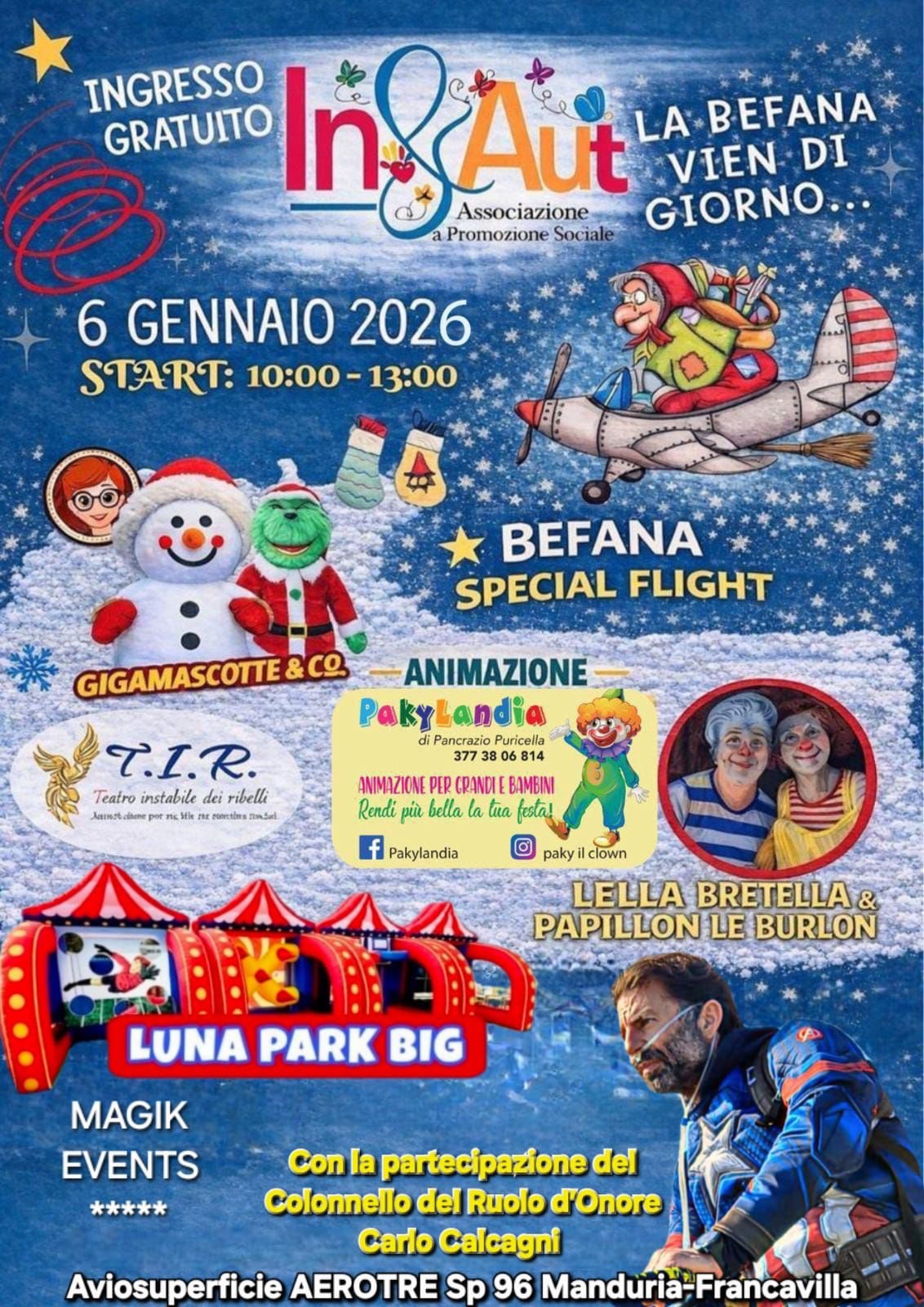 Il 6 gennaio 2026, dalle ore 10:00 alle 13:00, l’Aviosuperficie AEROTRE lungo la SP 96 Manduria–Francavilla ospiterà “Befana Special Flight – La magia arriva dal cielo”, evento gratuito dedicato alle famiglie e ai bambini organizzato da In&aut associazione che si occupa dei bambini con disturbo del neurosviluppo.