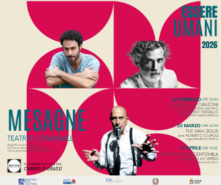 Nella storica cornice del Teatro comunale di Mesagne prende forma ESSERE UMANI 2026, un percorso artistico articolato in tre appuntamenti che portano in scena linguaggi, visioni e poetiche del teatro contemporaneo, ideata da ErgoSum Produzioni in collaborazione con la Ditta Carmelo Grassi.