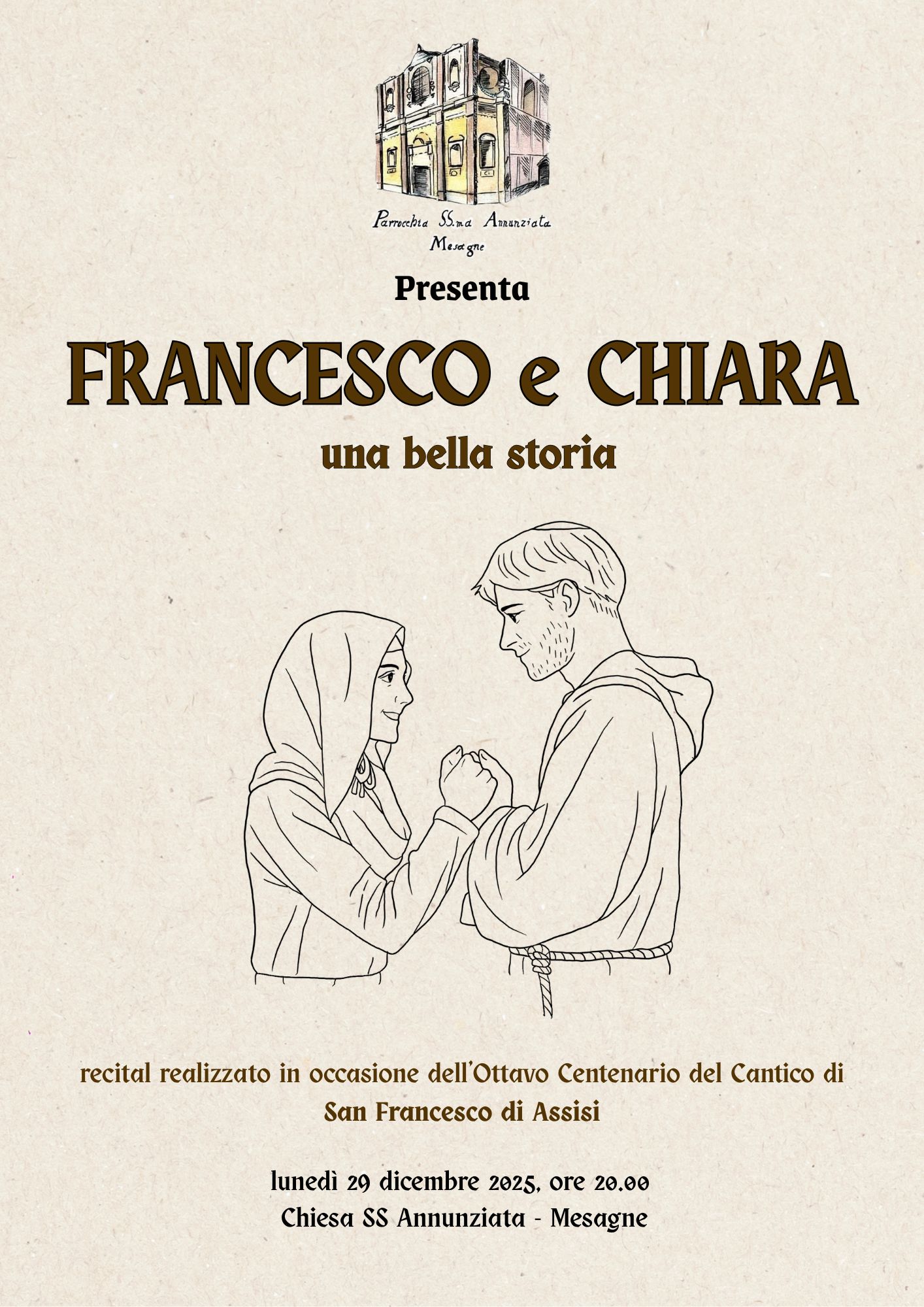 Lunedì 29 alle ore 20.30, presso la Parrocchia Ss.ma Annunziata di Mesagne, si terrà il recital “Francesco e Chiara, una bella storia”, un evento artistico e spirituale dedicato alla vita dei due santi di Assisi.
